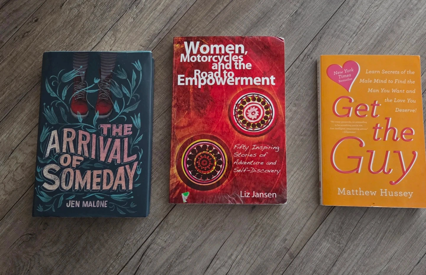 Three books for free.. 'The Arrival of Someday' by Jen Malone. 'Women, Motorcycles and the Road to Empowerment' with fifty inspiring stories by Liz Jansen. 'Get the Guy' by Matthew Hussey. These books are in good condition.