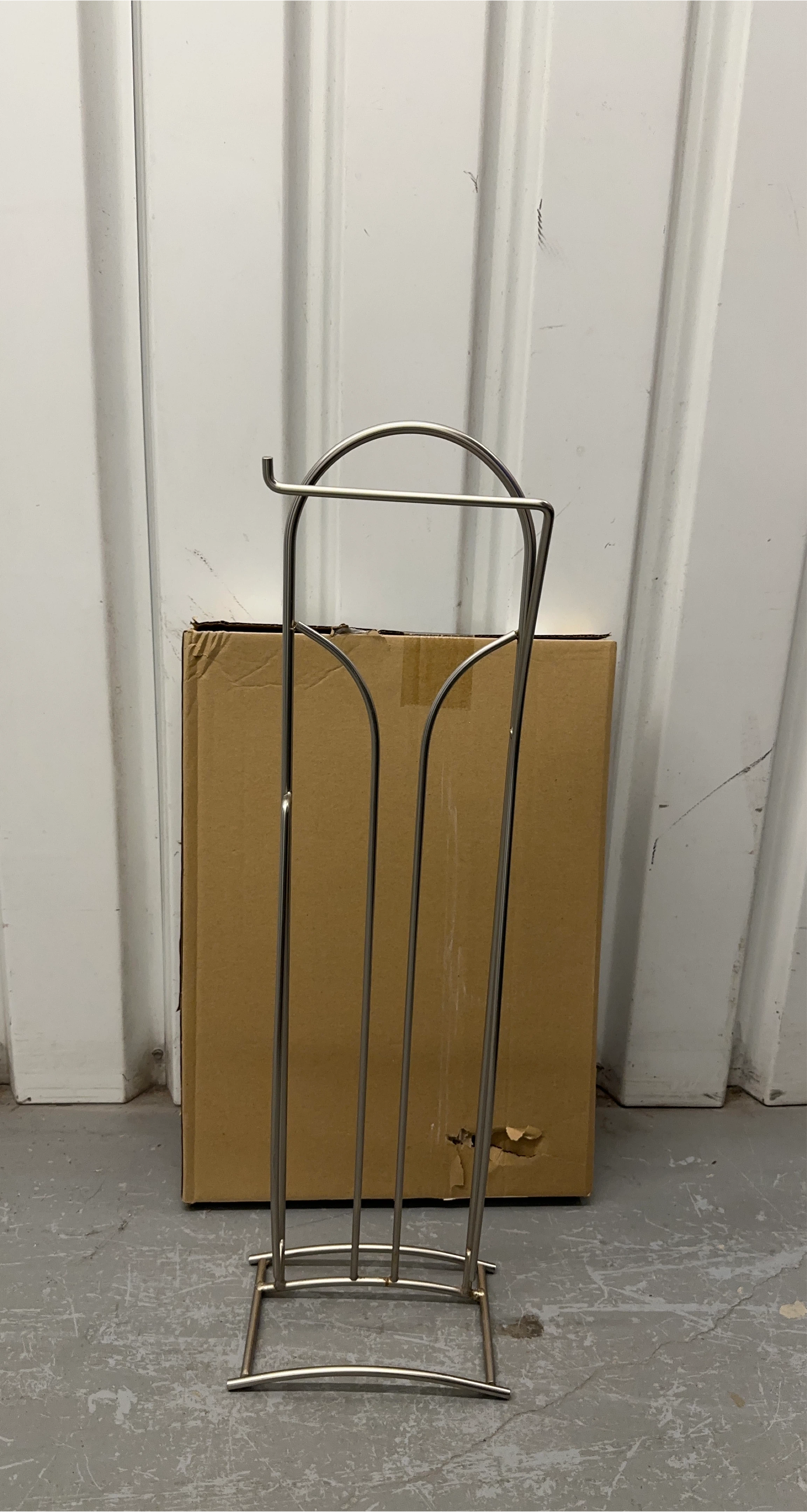 103This is a toilet paper holder stand in good condition. It's made of metal and has a sleek design. Perfect for keeping your toilet paper organized and accessible in your bathroom