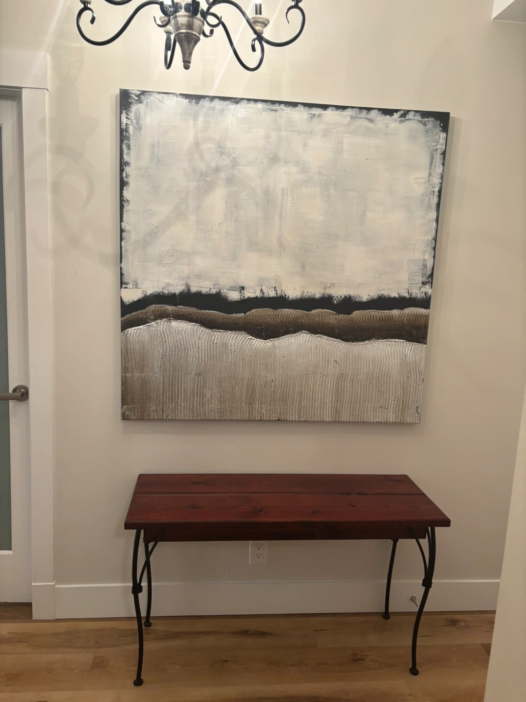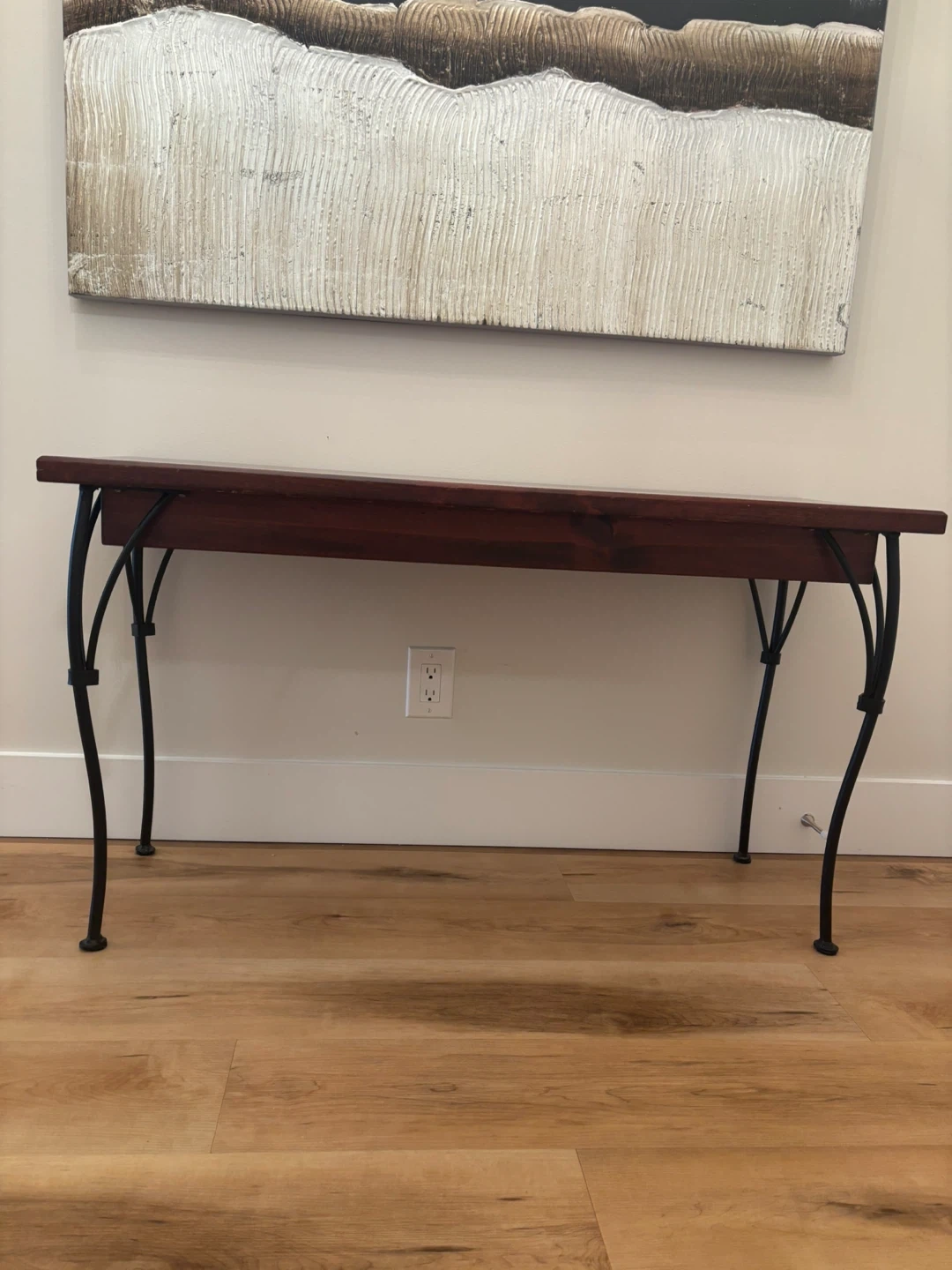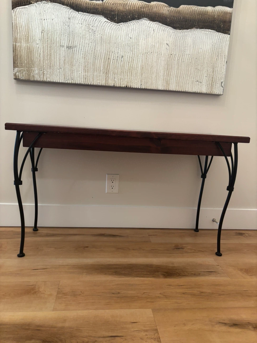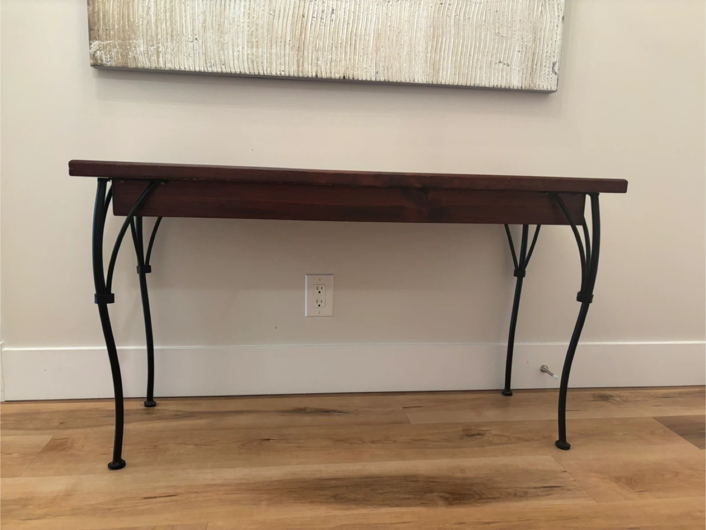 Stunning long accent entry table. Solid wood with blank iron legs also good as a tv stand or behind a couch table. Quite heavy weight.