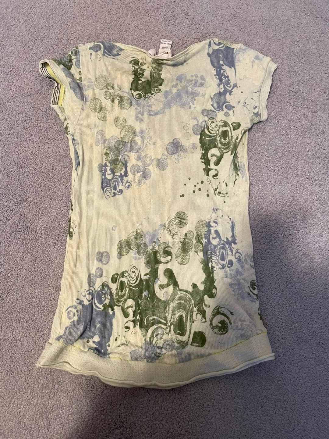 This is a Diesel women's t-shirt with a unique graphic print. It's a short-sleeved, v-neck style. Made from a ribbed knit fabric.