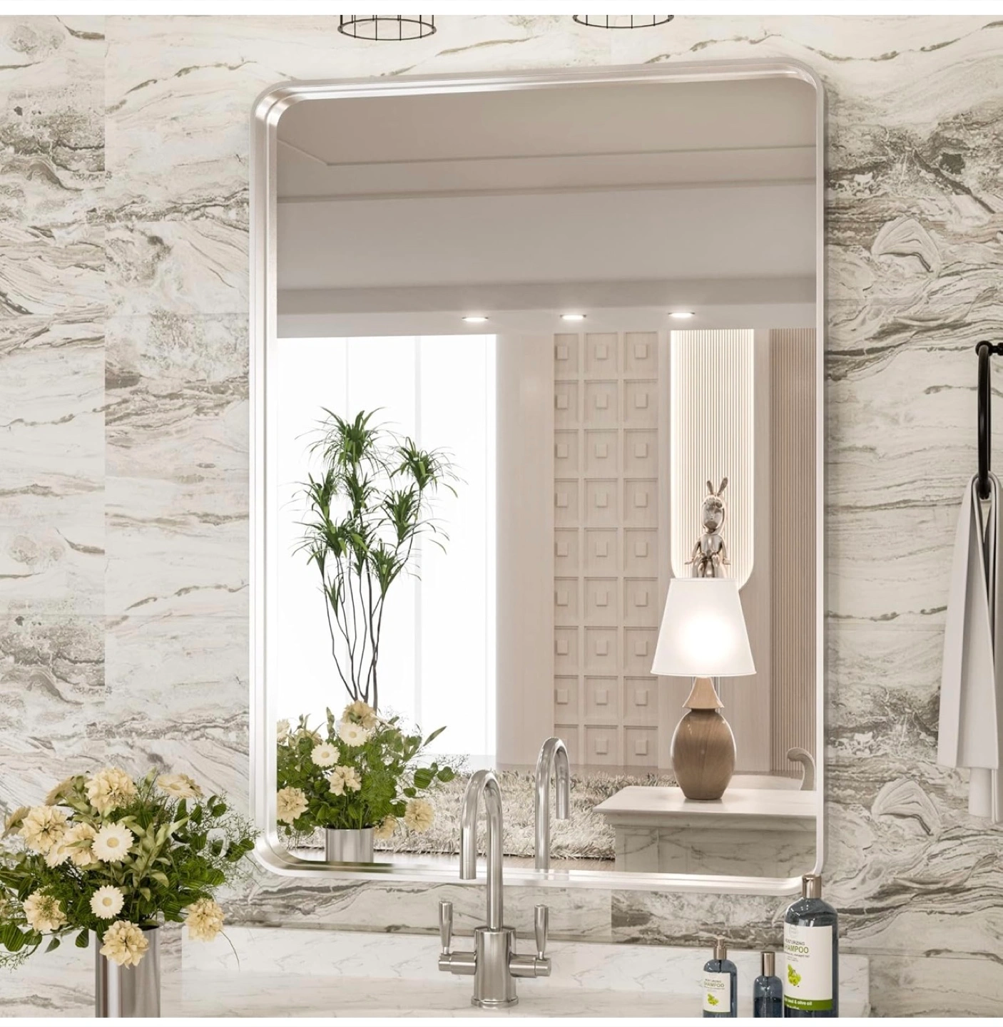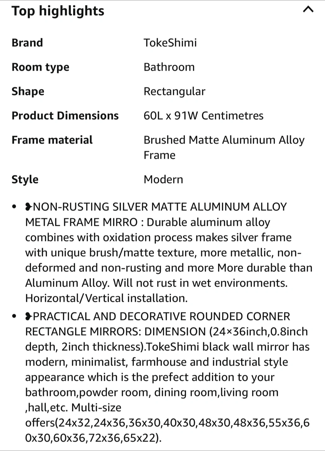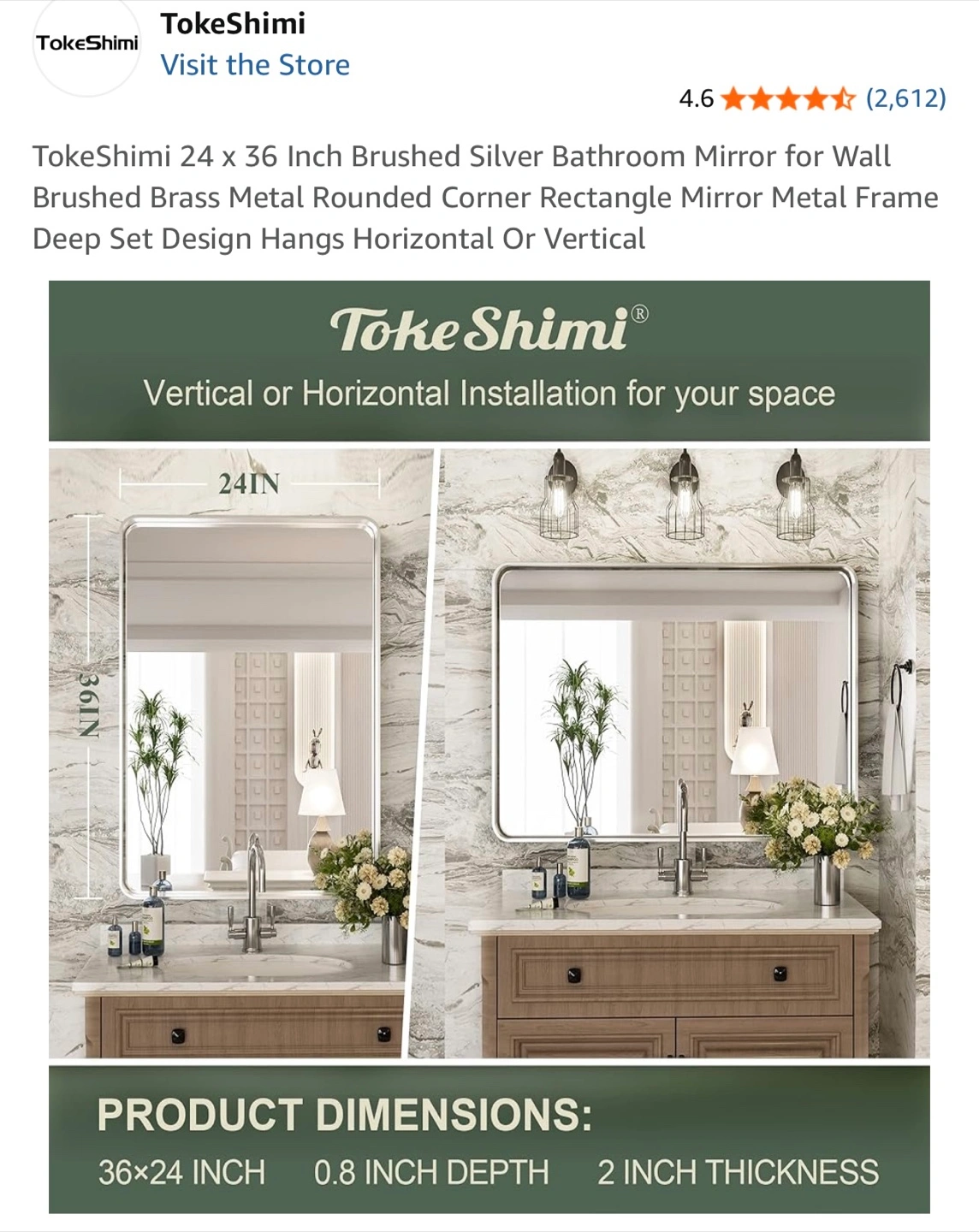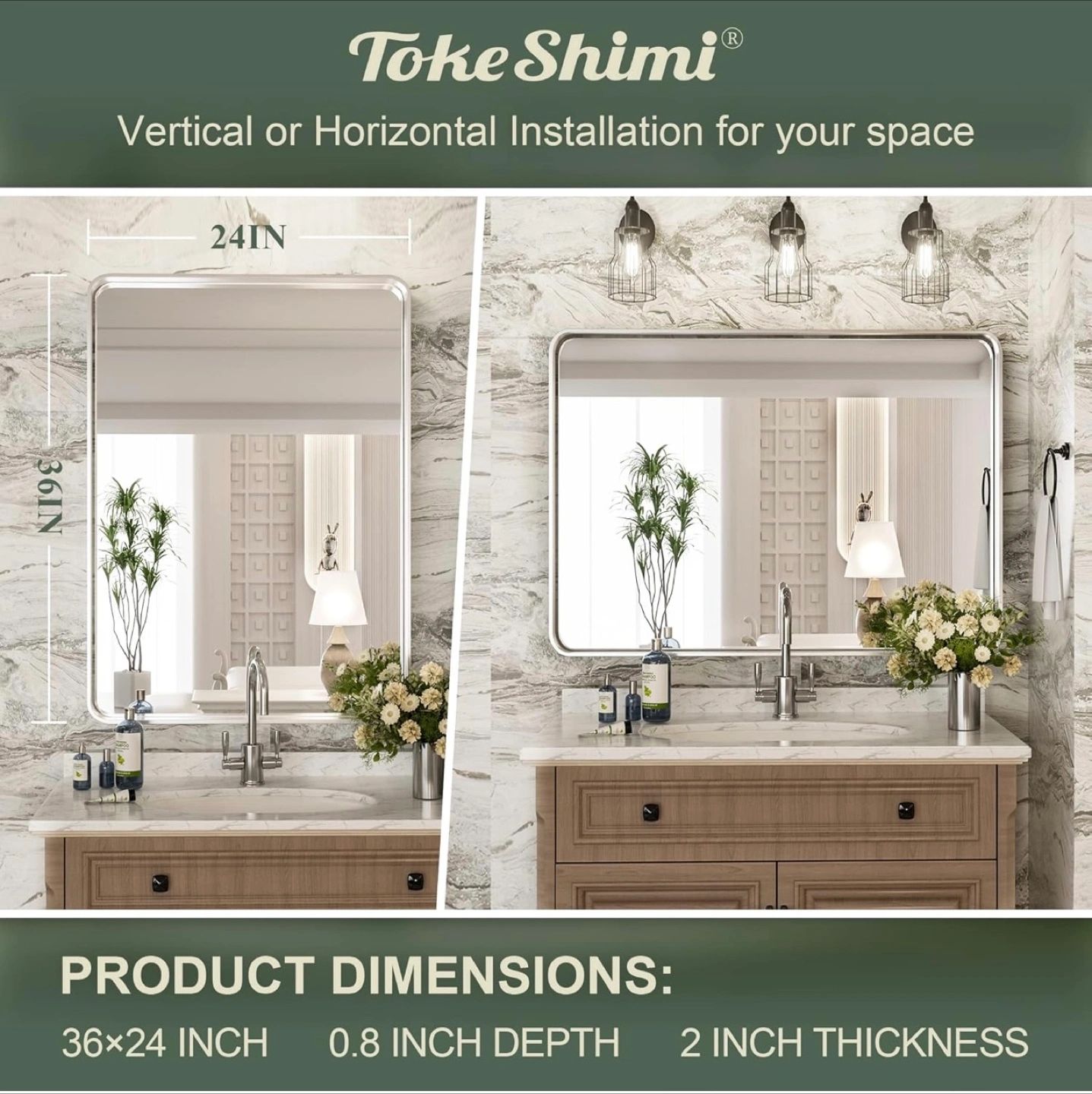 10Selling a TokeShimi bathroom mirror in brushed silver! It's a modern, rectangular mirror with a brushed matte aluminum alloy frame. The dimensions are 24 x 36 inches, with a 0.8 inch depth and 2 inch thickness. It can be installed either vertically or horizontally, and it's perfect for adding a touch of modern style to your bathroom
