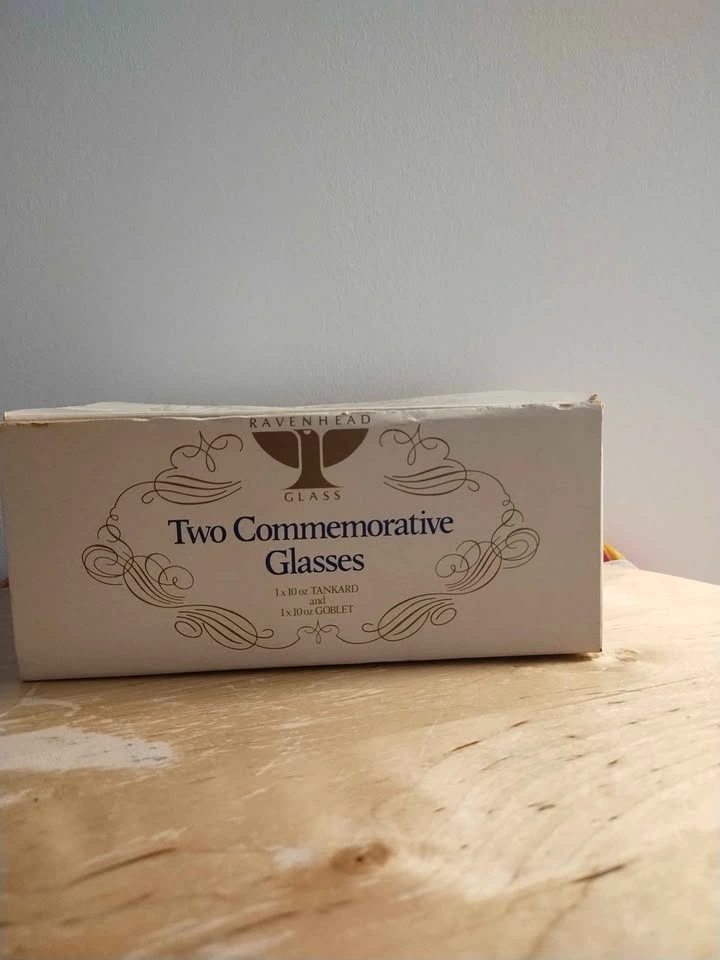 Pair of items created to commemorate the July 1981 wedding of Prince Charles and Lady Diana Spencer. One is a small glass mug, standing about 4.5" tall. The other is a 5.75" tall clear glass stemmed goblet. Both have the same image and banner showing the royal couple. No chips or cracks. The box is discoloured from age. (See photos).