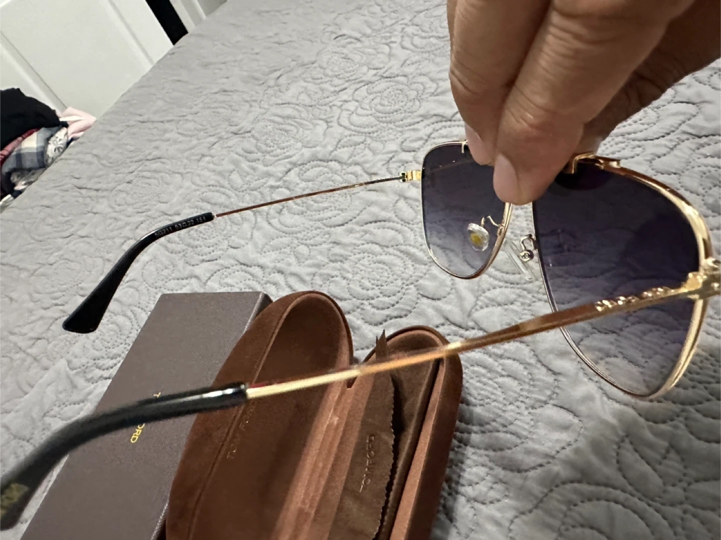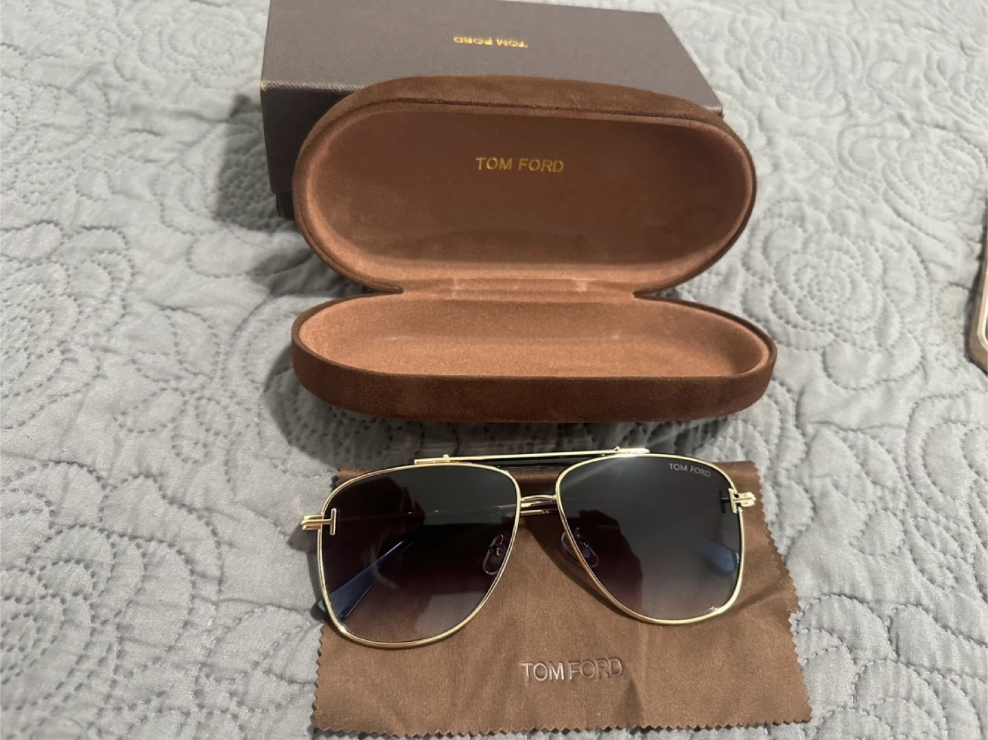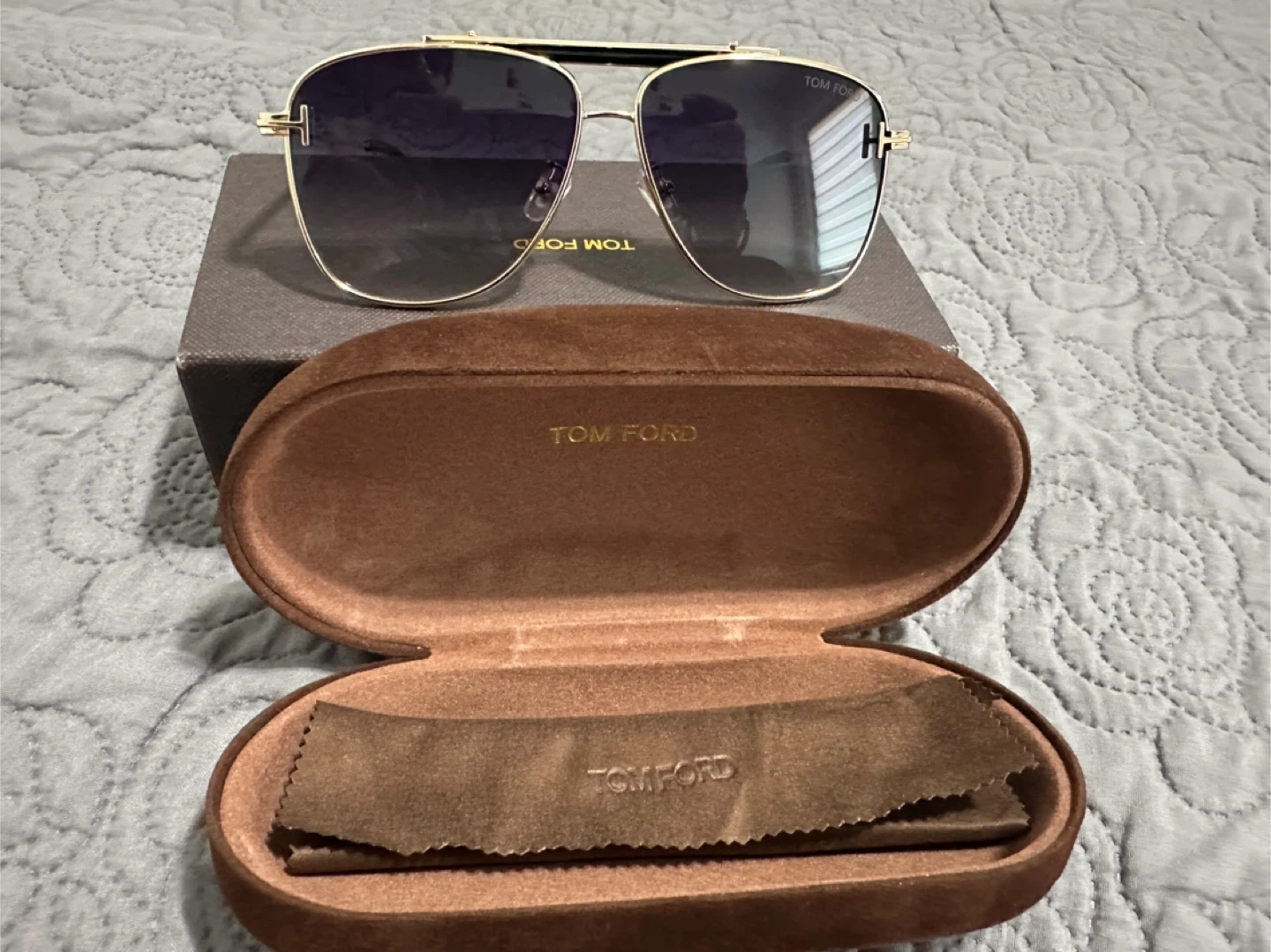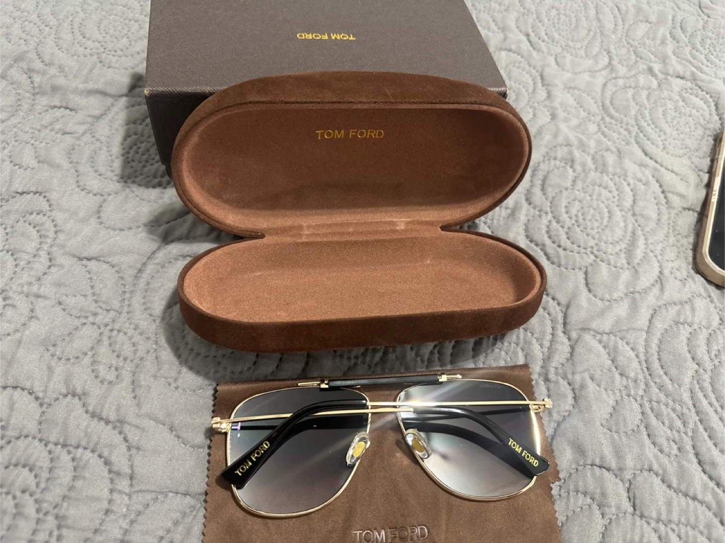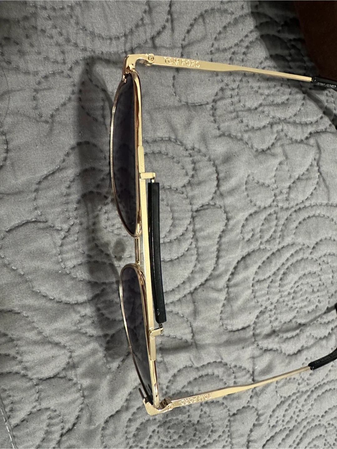 Selling a pair of Tom Ford aviator sunglasses! They come with the original case and cleaning cloth. The frames are gold and the lenses have a gradient tint. They're Brand new and ready for a new home!