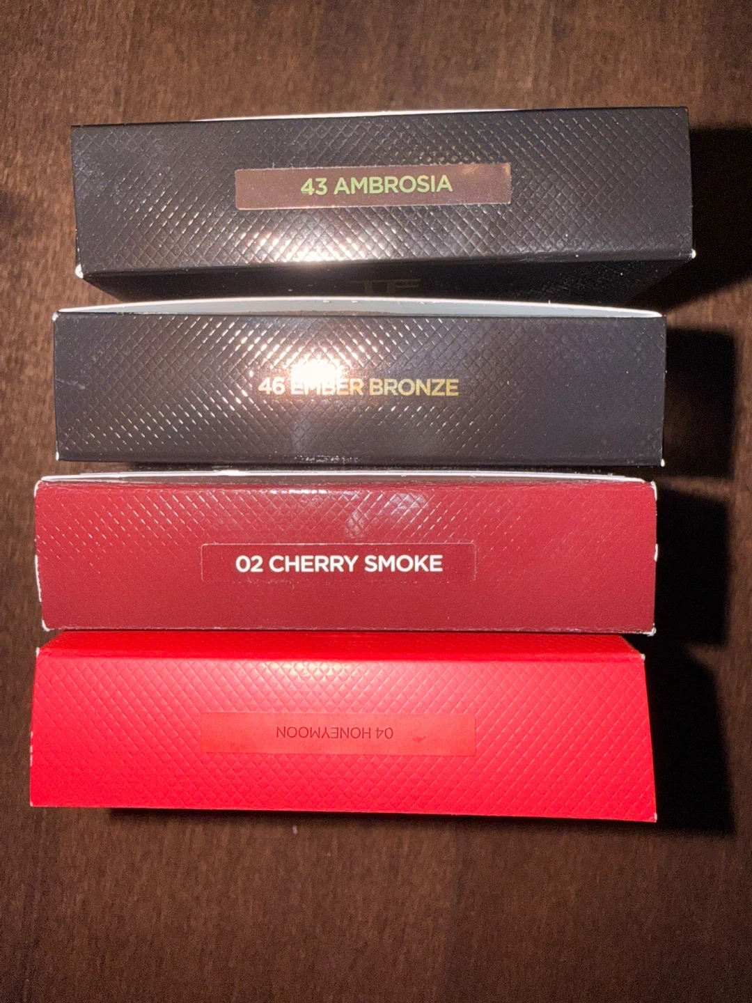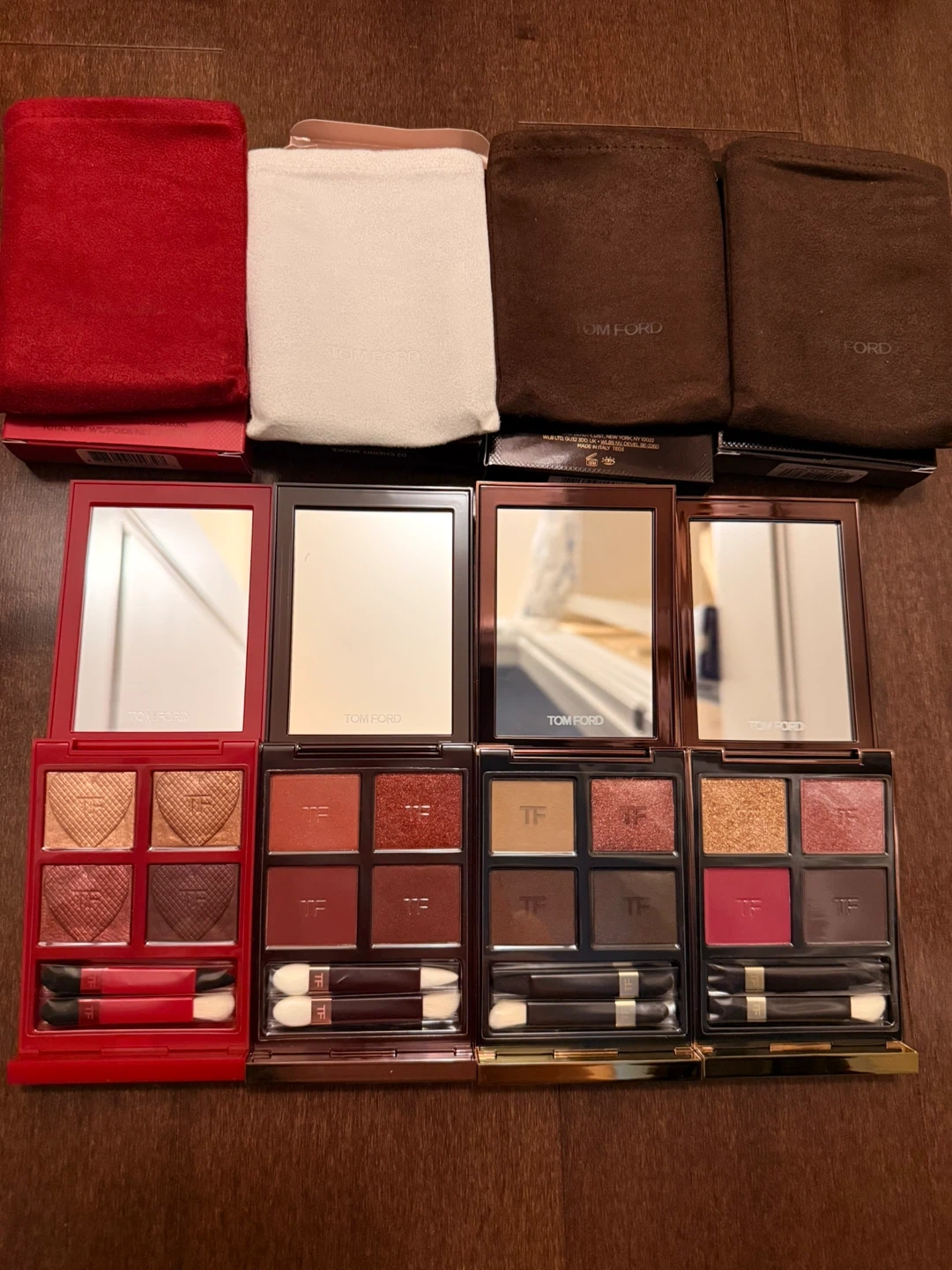 Selling a set of four Tom Ford Eye Color Quad eyeshadow palettes. Each palette comes in its original box and includes the applicator. The shades included are: - 43 Ambrosia - 46 Ember Bronze - 02 Cherry Smoke - 04 Honeymoon