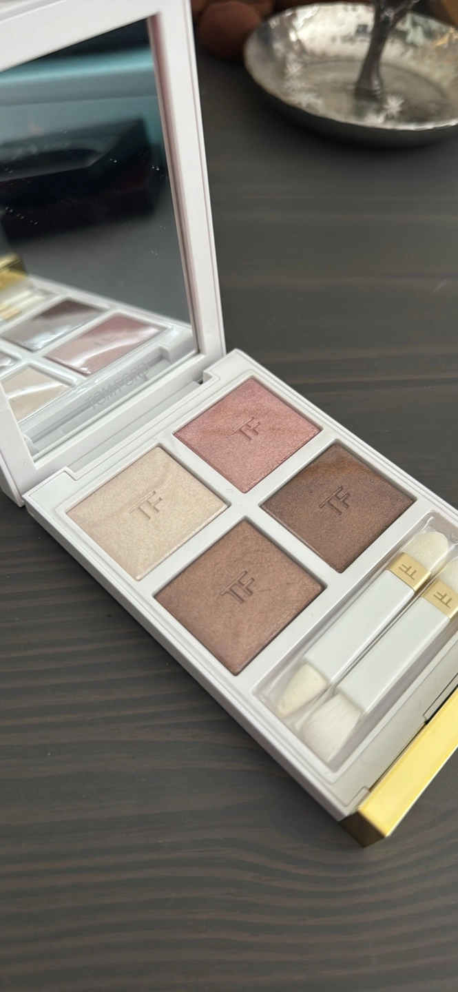 Brand new. Four-shade eyeshadow palette. Compact with mirror. Includes applicators. Shades range from light to medium brown.