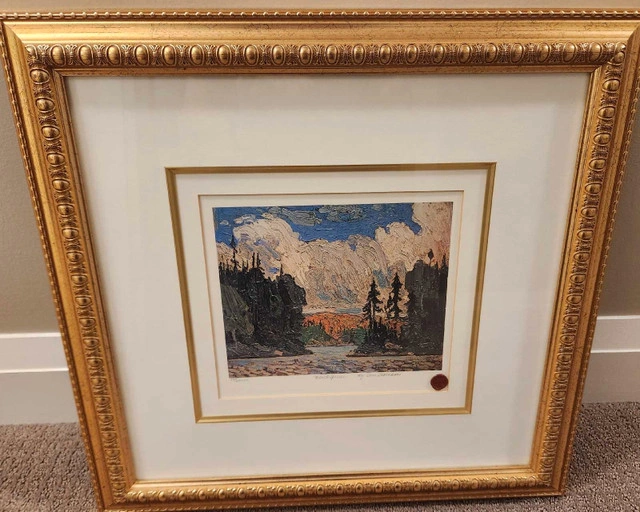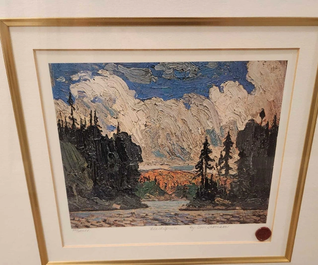 91This is a framed Tom Thomson print, capturing the beauty of the Canadian landscape. This piece is numbered 330/695 p.p. It has a classic gold frame that complements the artwork beautifully. The print is in excellent condition, ready to enhance any room with its serene imagery. * Artist: Tom Thomson * Print Number: 330/695 p.p. * Frame: Gold If you're reading this, it's still available! Don't miss out on adding this piece of Canadian art history to your collection.