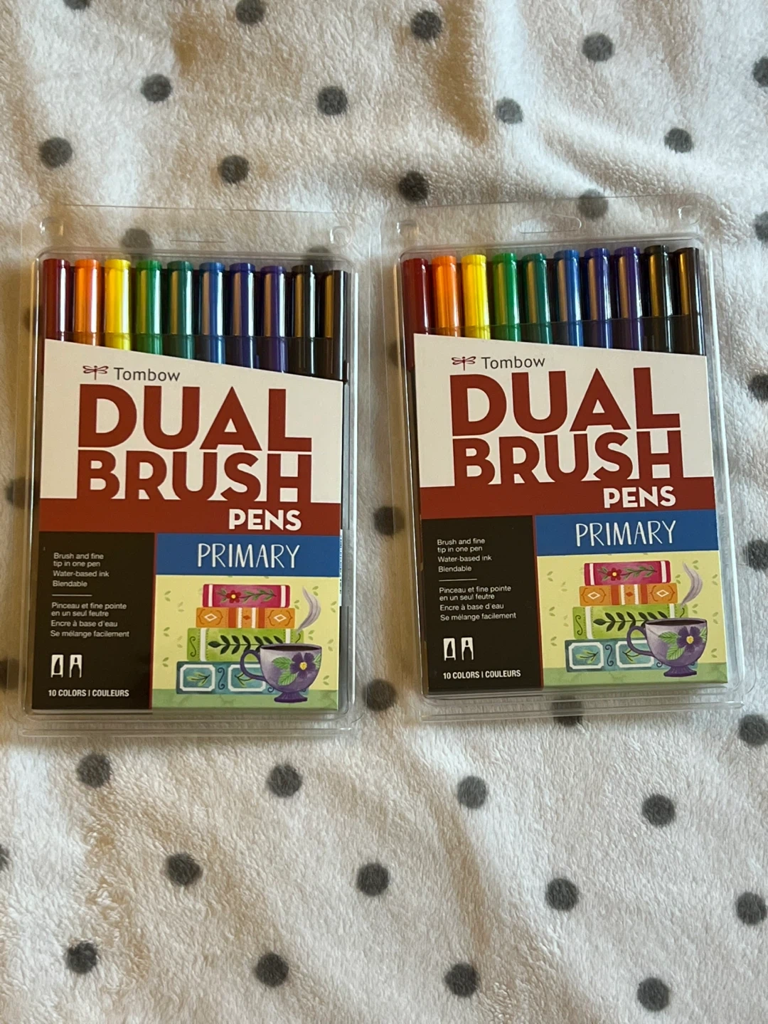70I'm selling two brand new sets of Tombow Dual Brush Pens in the Primary colour set! Each set includes 10 different colours. These pens feature both a brush and fine tip, with water-based, blendable ink. Perfect for any art project! Retail $44.99 Each. Take both for $75