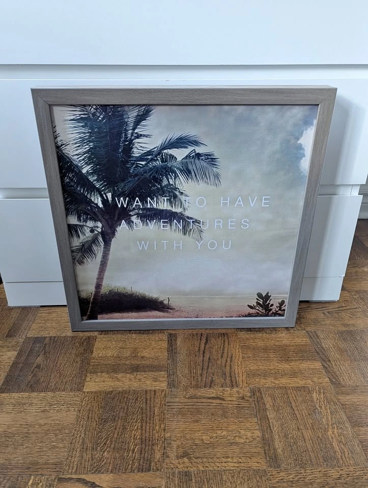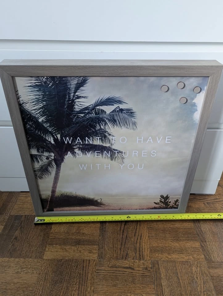Beautiful Petal Lane Home magnet board with a tropical beach print and the quote “I Want to Have Adventures With You.” Comes with the original magnets and hardware for hanging. Originally sold at Indigo for $79. Size is 19.5" x 19.5" (shown in photos). Great condition, just no longer needed.