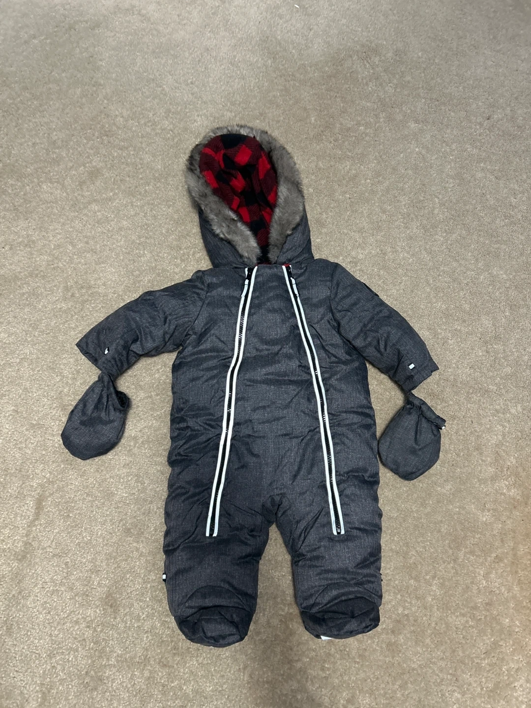10Keep your little one warm this winter with this adorable Tommy Hilfiger baby snowsuit! It's in great condition and features a cozy hood with a faux fur trim and a stylish red and black plaid lining. Perfect for those chilly Canadian days!