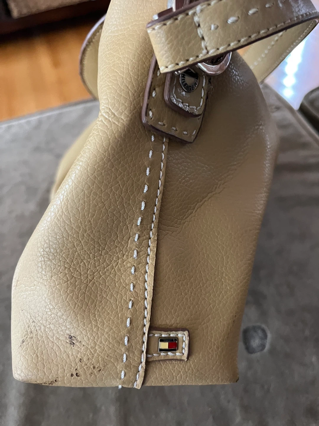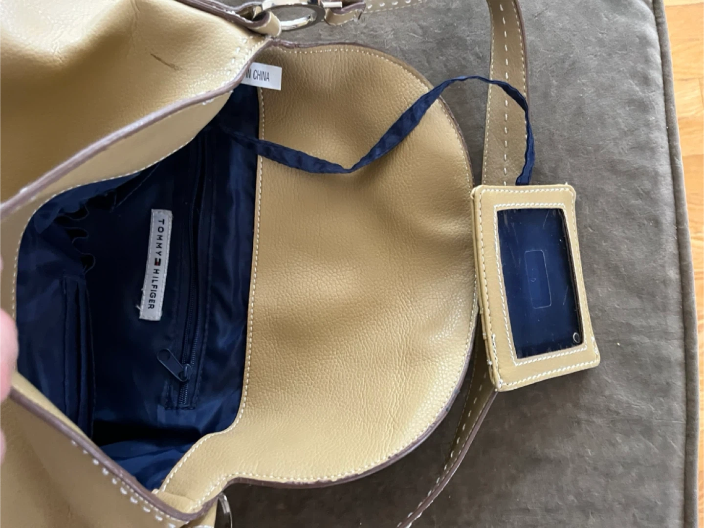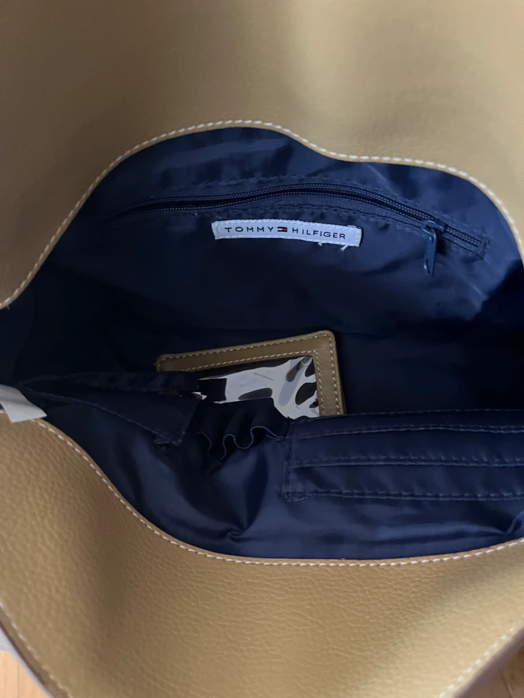 15Tommy Hilfiger shoulder bag in a lovely beige colour. It's in great shape and perfect for everyday use! The bag has a navy blue interior lining and a few pockets to keep your things organized
