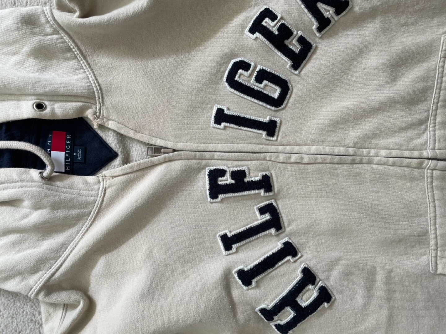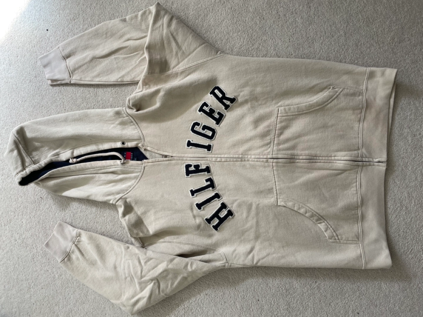 Men’s Medium. Cream-coloured zip-up hoodie. Features a large Tommy Hilfiger logo across the chest. Long sleeves, hooded. Great for layering.