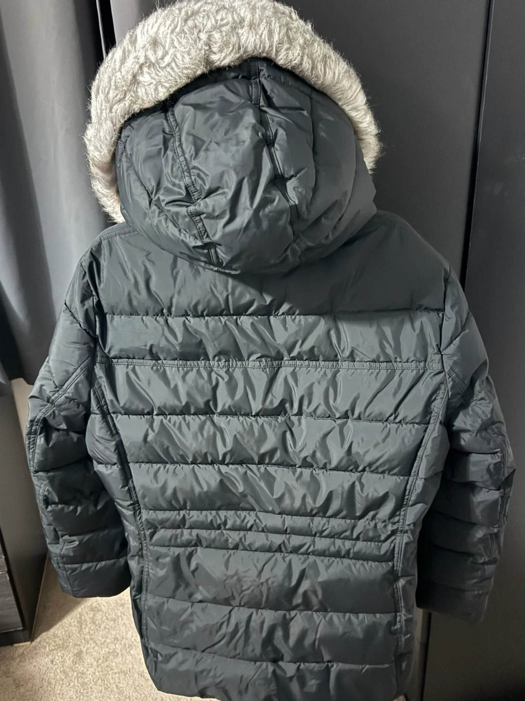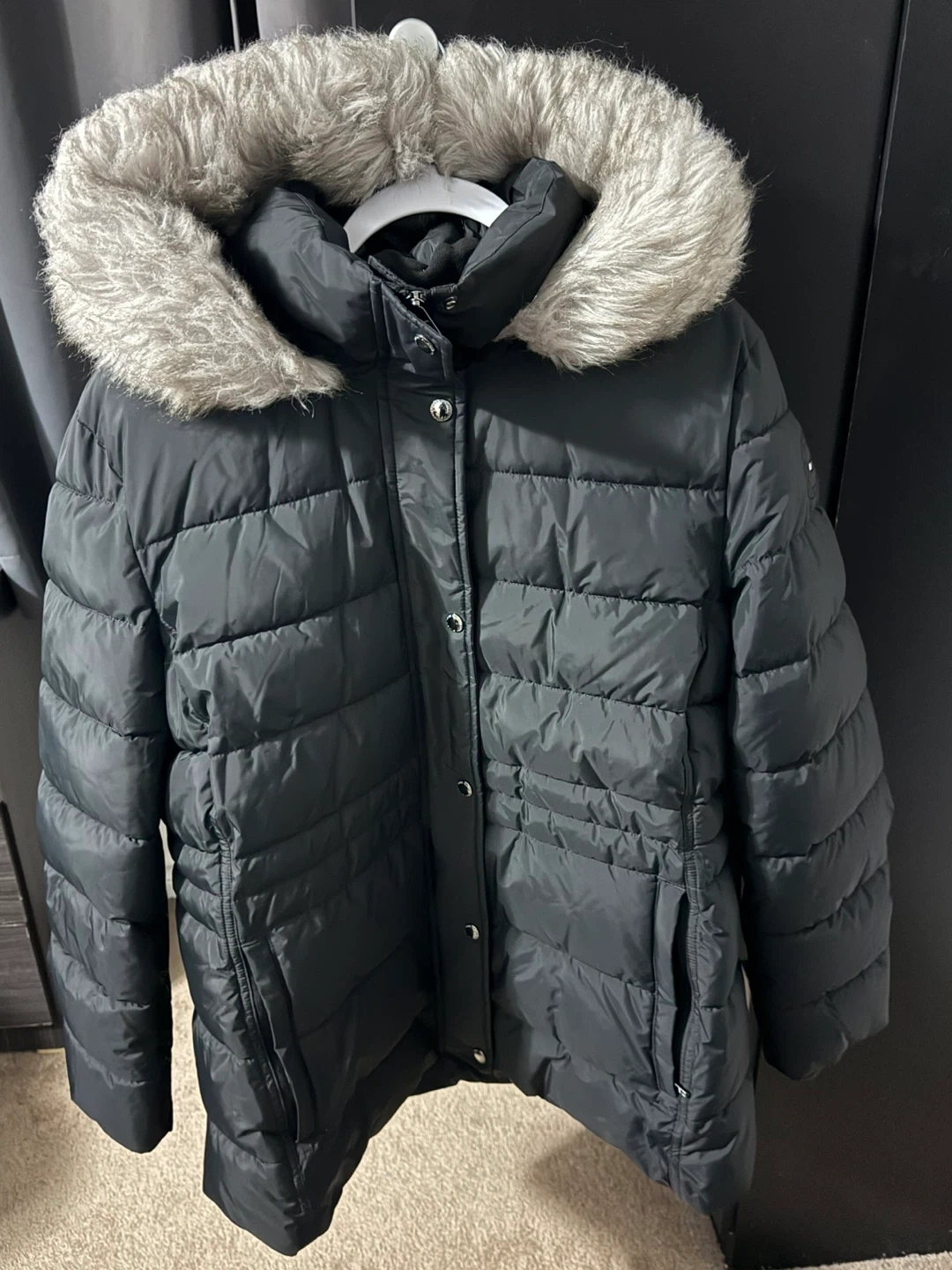 10Stay warm and stylish with this Tommy Hilfiger puffer jacket! It's a sleek black colour and perfect for the Canadian winter. The jacket features a faux fur-trimmed hood, adding a touch of cozy elegance. It has ever been worn.