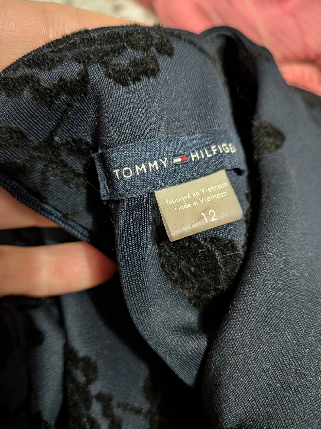 157Tommy Hilfiger Navy Blue dress in good condition It's a beautiful blue colour with a black floral flocked pattern. Perfect for a special occasion or a night out Size 12 Good condition with no issues. Bottom hem seam came apart, so restitched Cash only, No etransfers No holds, first come, first serve Location: Etobicoke. Rathburn Rd and Renforth dr. Etobicoke Olympium nearby. I cannot meet outside this area