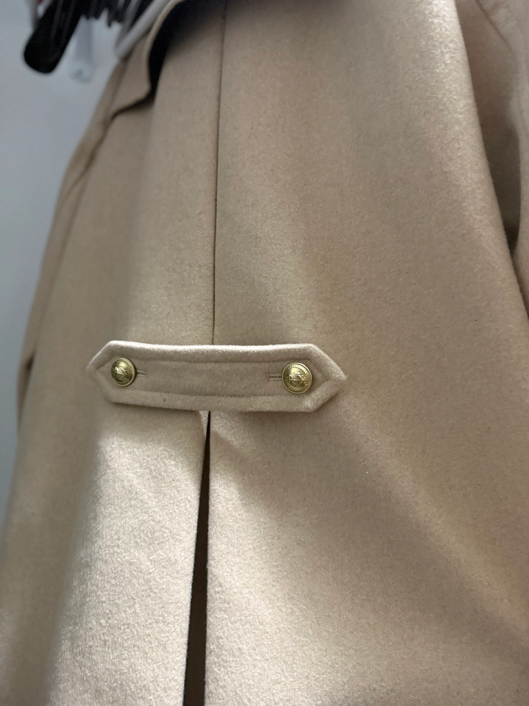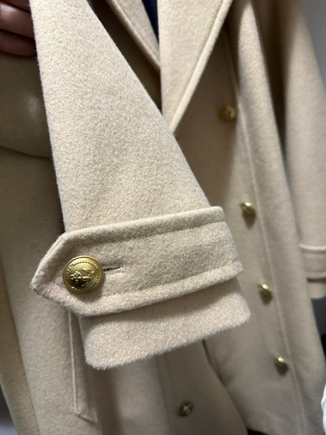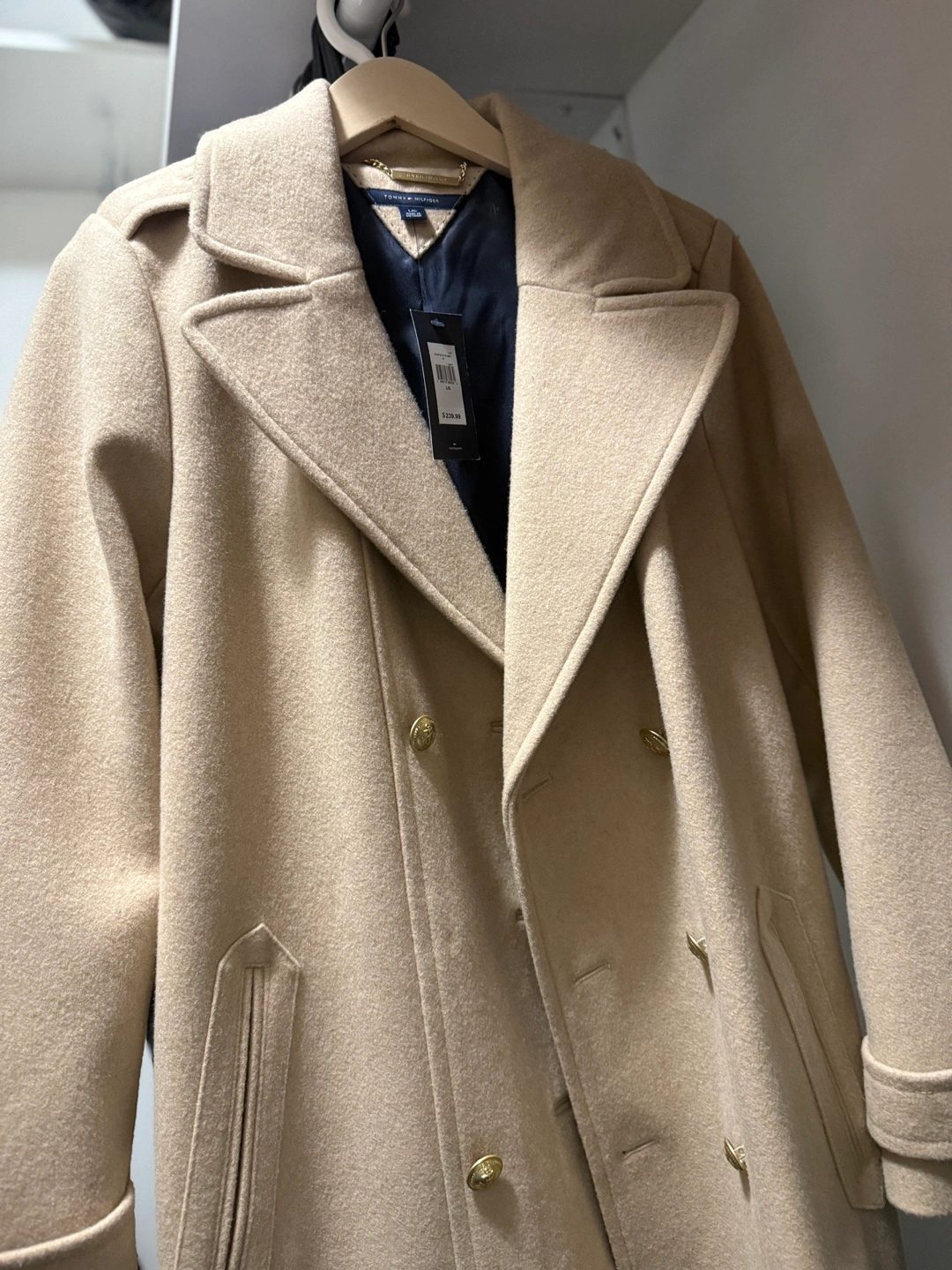 33Brand new! Gorgeous camel-coloured wool blend peacoat. Double-breasted with gold buttons. Large size. New with tags.