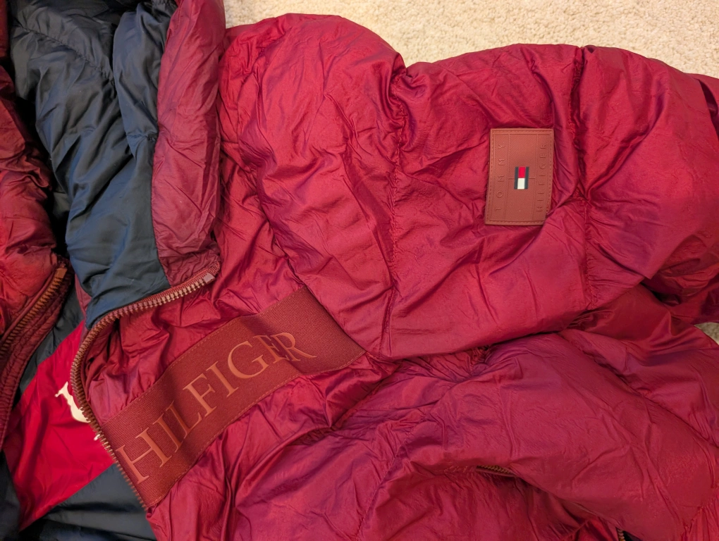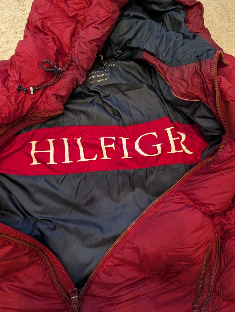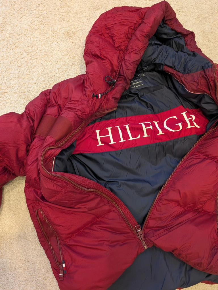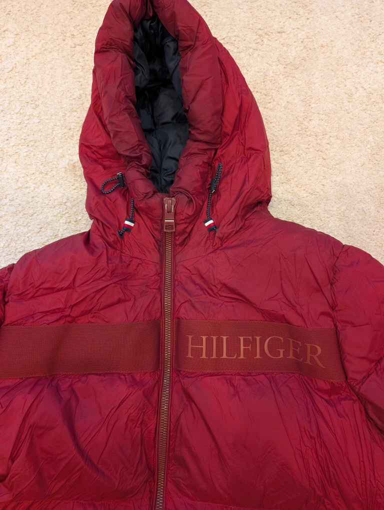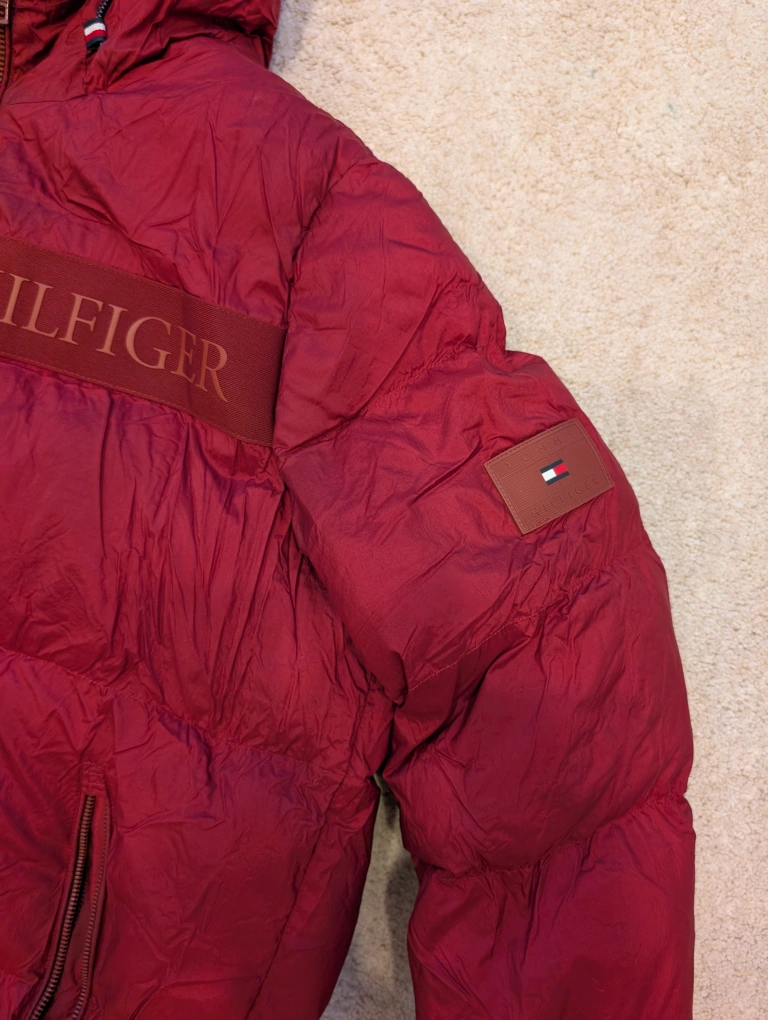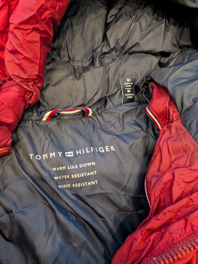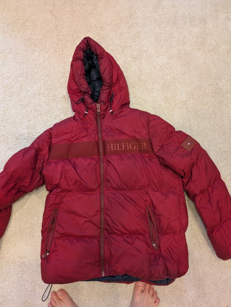 Tommy Hilfiger down puffer jacket in a nice red colour! It's a size medium and is warm, water-resistant, and wind-resistantm.. used for 2 seaons only..have the bill as well...