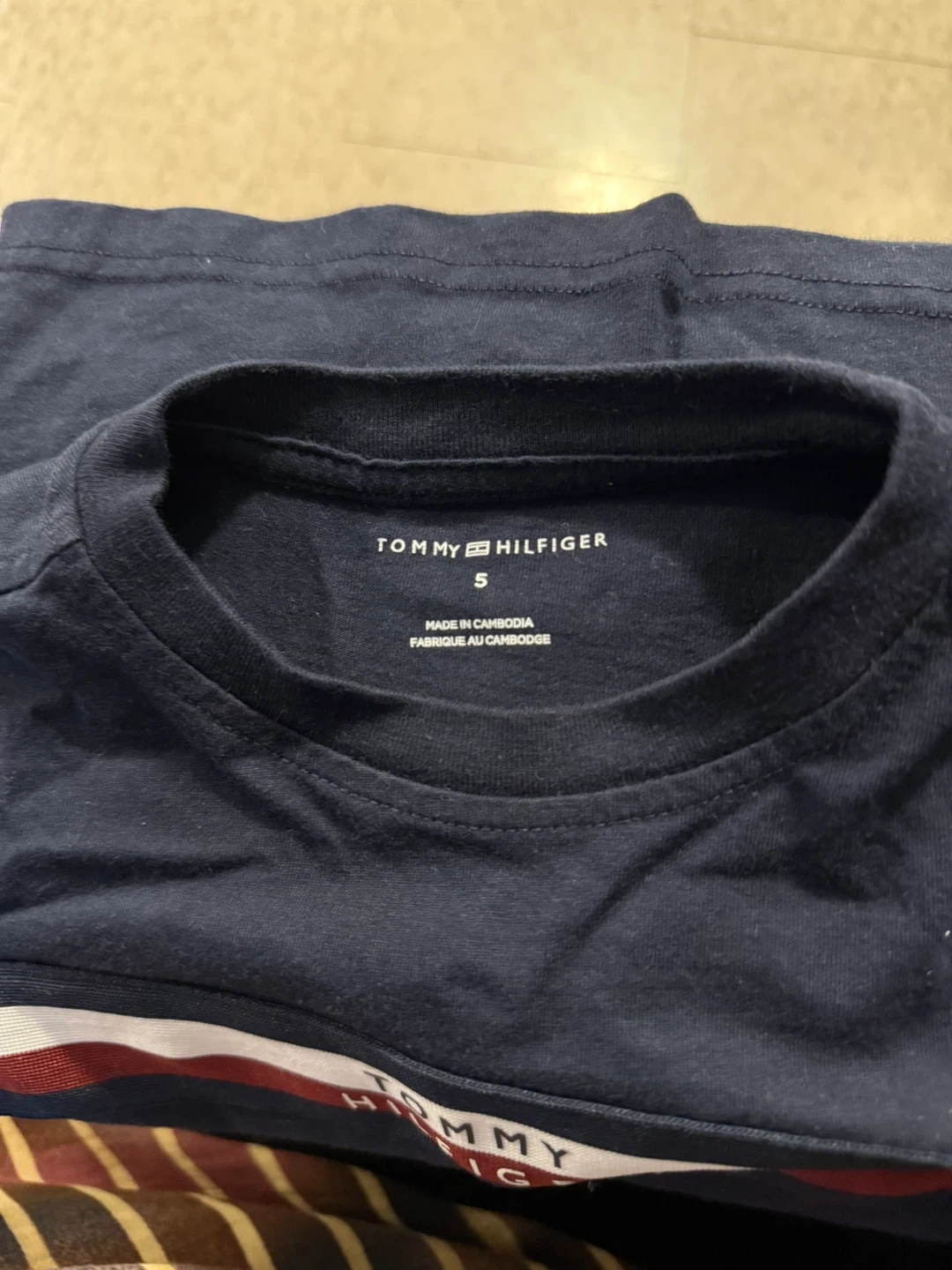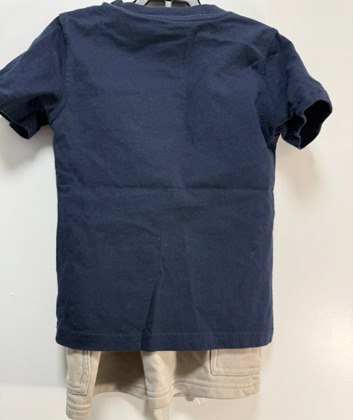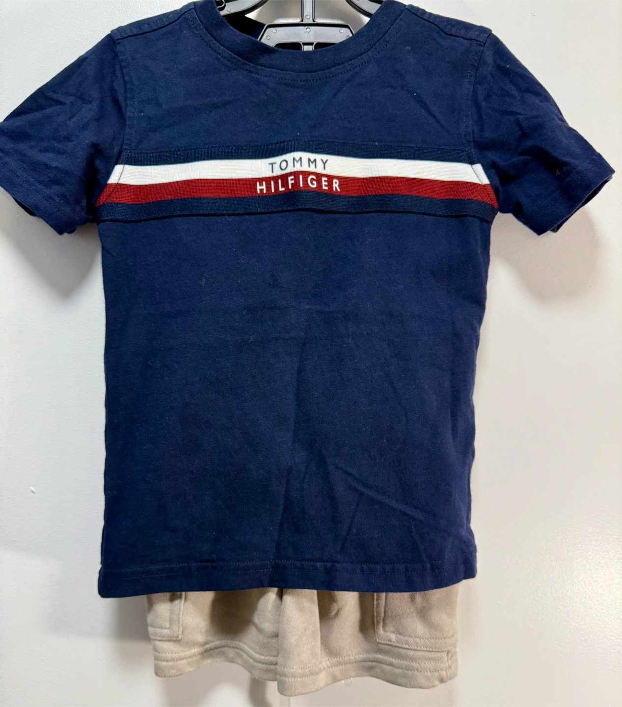 Tommy Hilfiger kids outfit in great condition! The set includes a navy blue t-shirt with the Tommy Hilfiger logo and beige shorts. Size 5