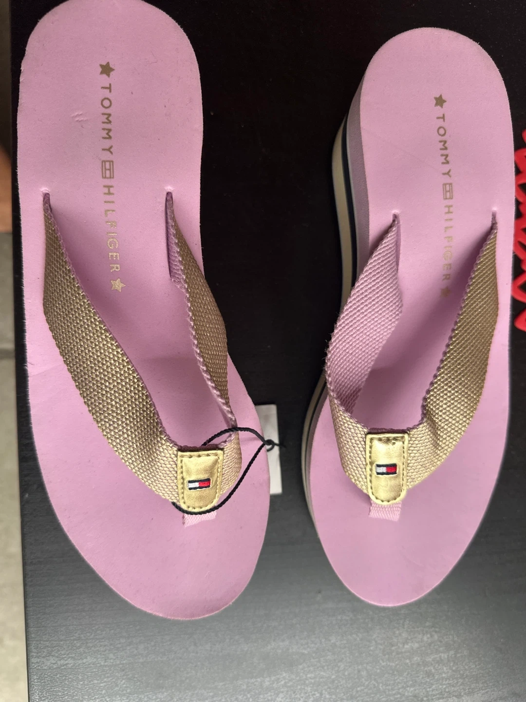 Cute Tommy Hilfiger flip flops in a pretty pink colour! They have a gold coloured strap and the Tommy Hilfiger logo on the strap as well