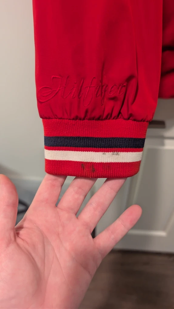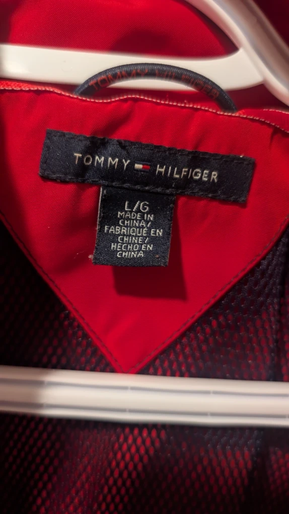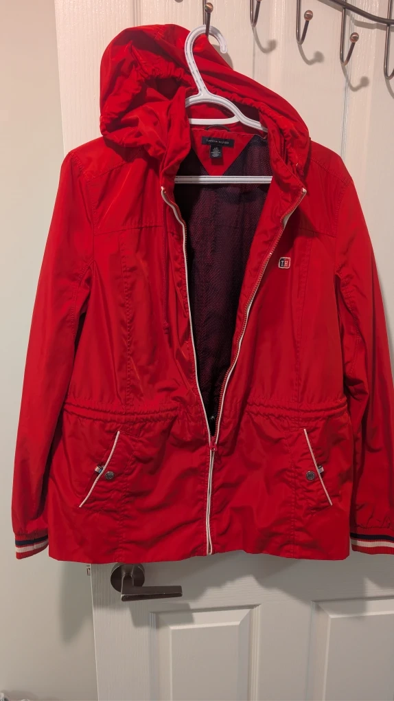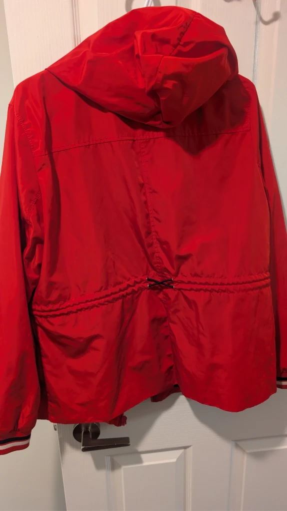60Selling a Tommy Hilfiger hooded jacket in red. It's a size large and has a drawstring at the waist. There are a couple of small marks on the cuff, as shown in the photos.