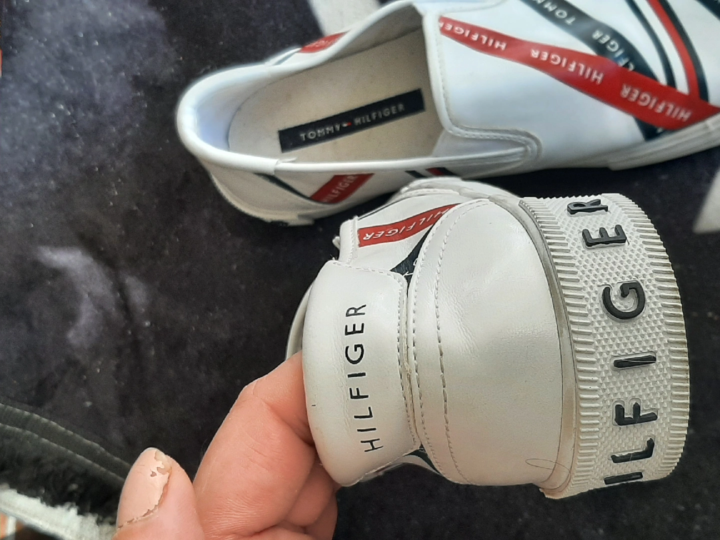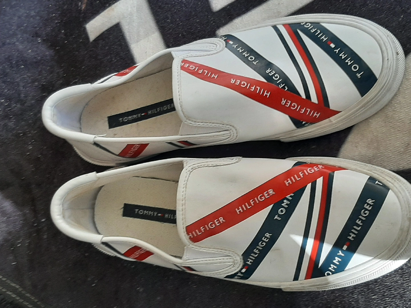 Selling a pair of Tommy Hilfiger slip-on sneakers! They're white with red and blue accents. Great for casual wear and easy to slip on and off