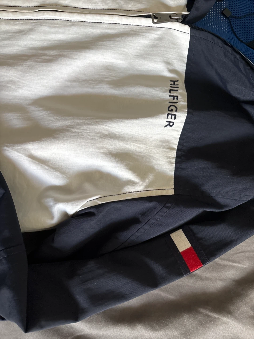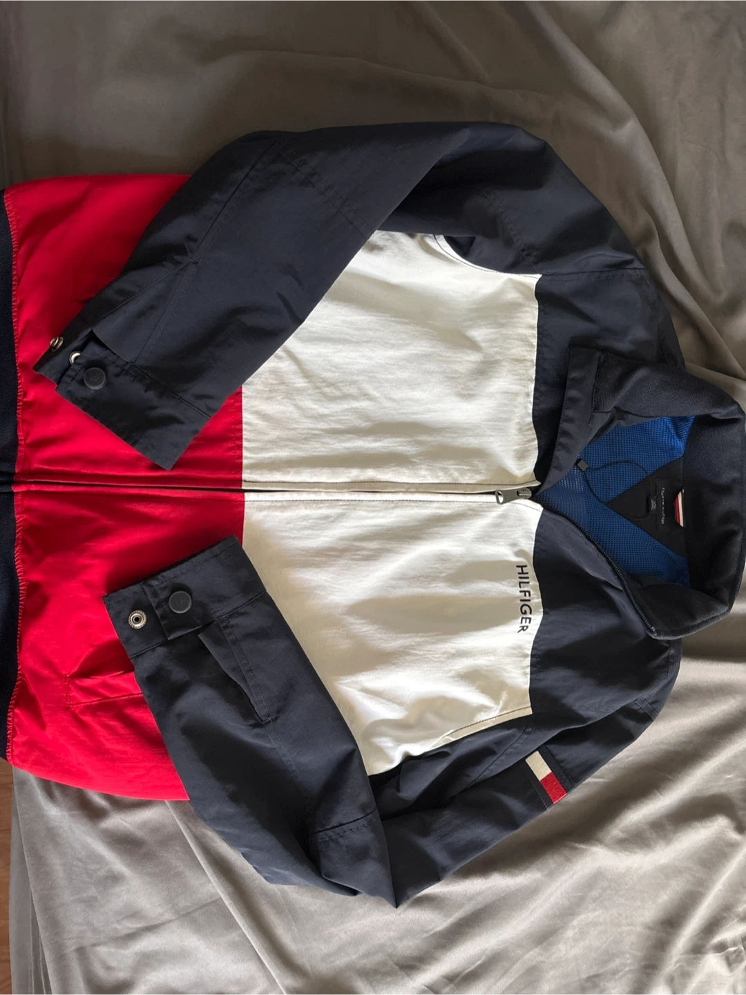 17Tommy Hilfiger windbreaker or jacket in excellent condition! It's a size XS and features a stylish colour-blocked design in white, navy, and red. Perfect for layering or wearing on its own during cooler day Amazing for wind New worn once or twice Pickup- Midland and Ellesmere