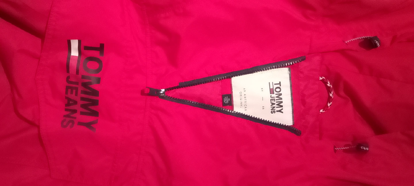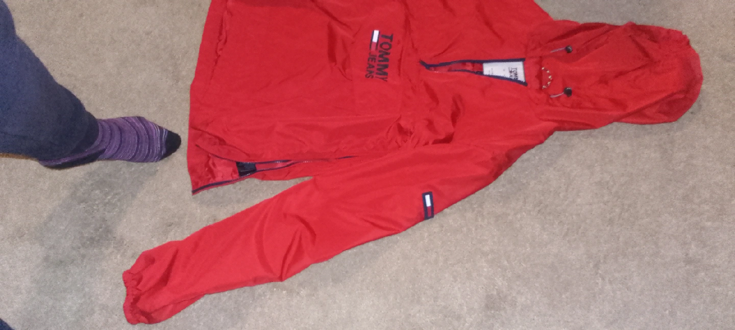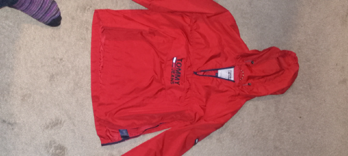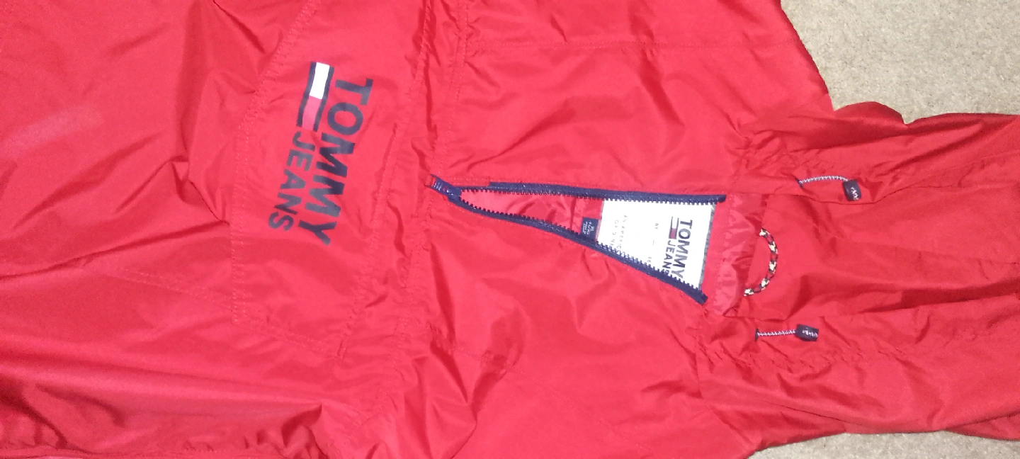 Selling a red Tommy Jeans anorak jacket. It's brand new. The jacket has a hood and a quarter-zip design. The picture makes it look slightly pink but it's the deep Red Tommy color. it's a size XL but it fits much smaller which is why I'm selling it, I bought a brand new around 30 days ago and it's a little snug for me. Should fit a size L or ML perfectly or a Small nice and loose. I paid $100 for it and it's only been tried on once but never worn "out" anywhere.