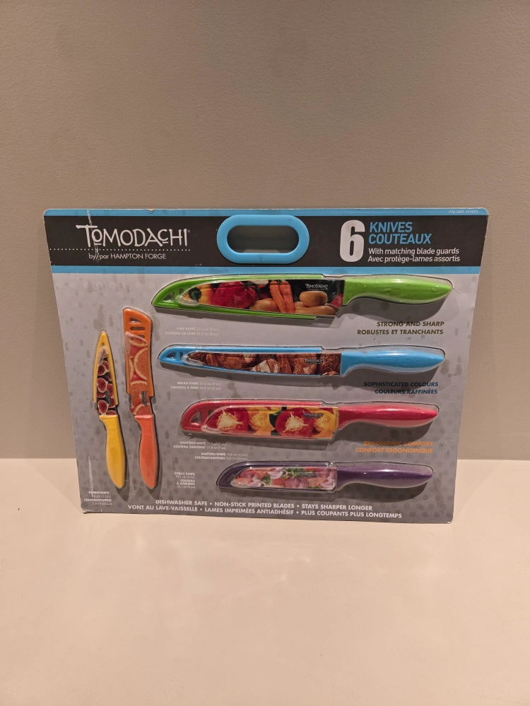 65Selling a Tomodachi 6-piece knife set by Hampton Forge! This set comes with matching blade guards and features non-stick printed blades. They are dishwasher safe and designed to stay sharper longer. The knives come in sophisticated colours and offer ergonomic comfort for easy use