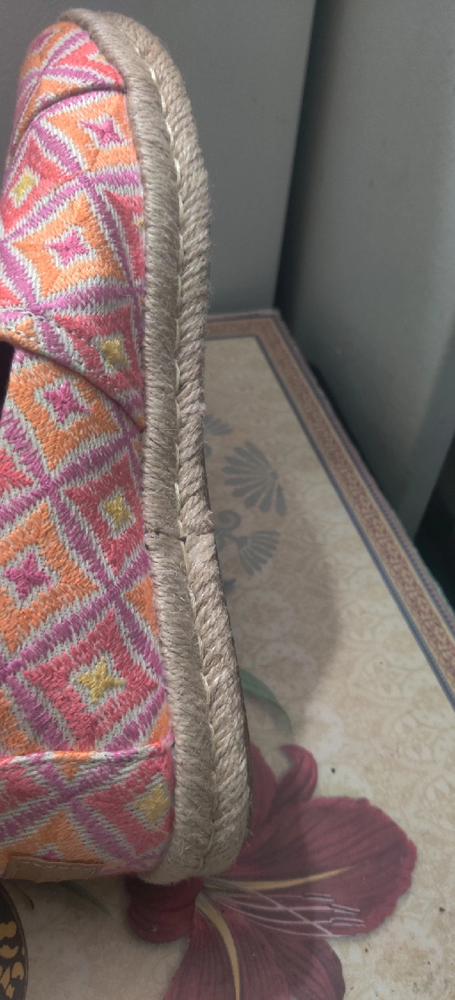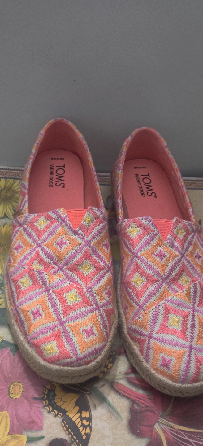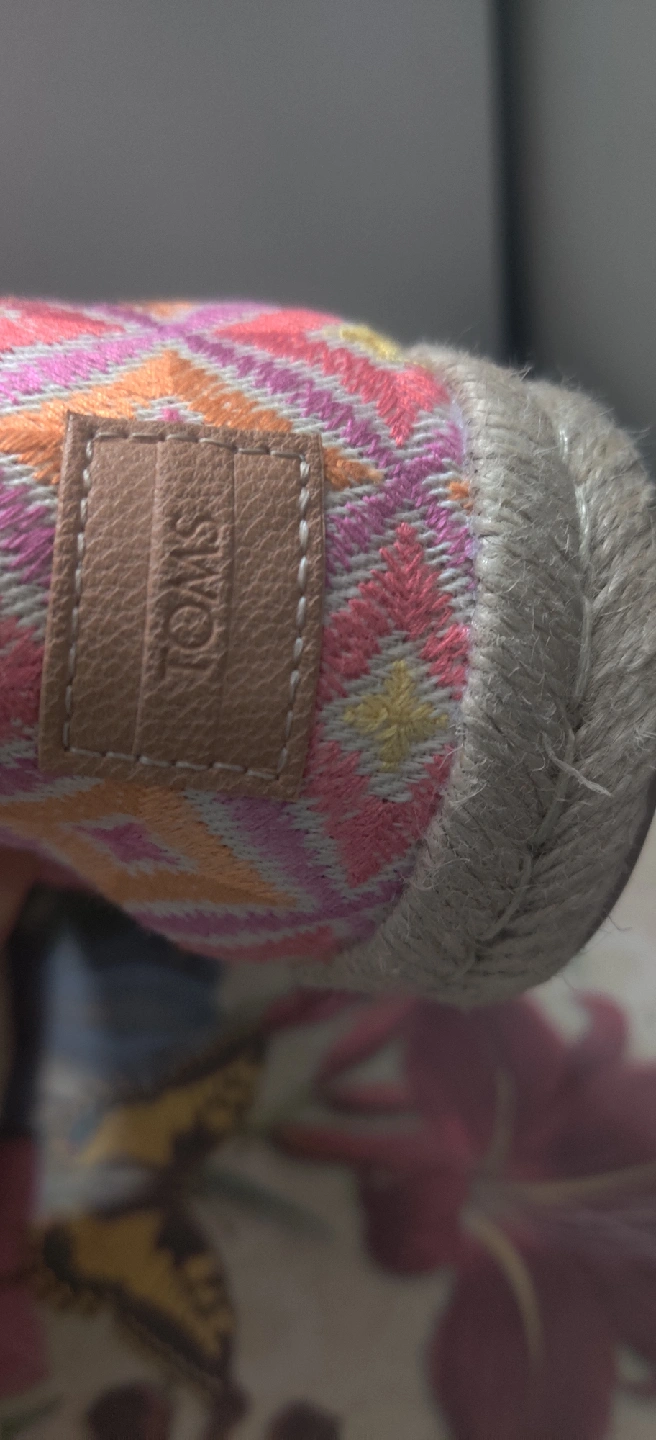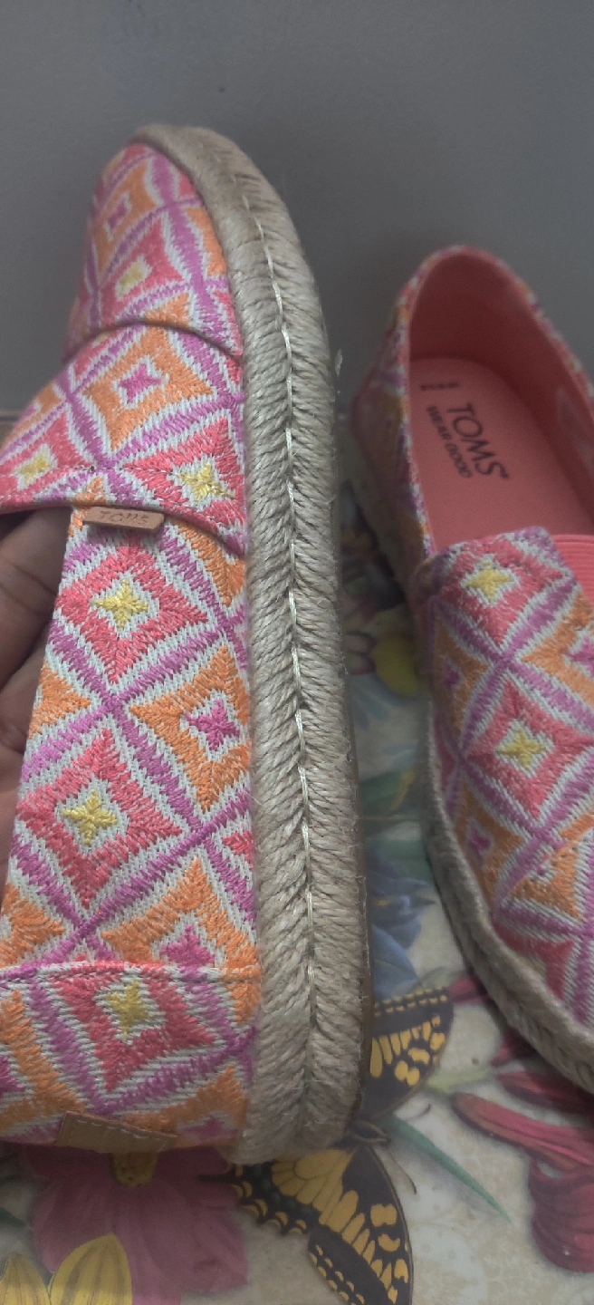 Selling a pair of TOMS women's slip-on shoes. They feature a colourful woven pattern and a comfortable, classic TOMS design. Perfect for casual wear! Worn once.