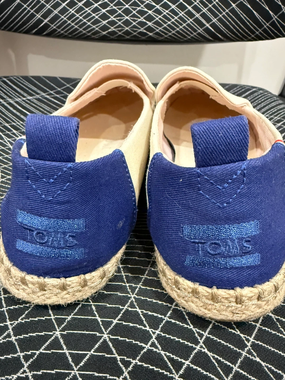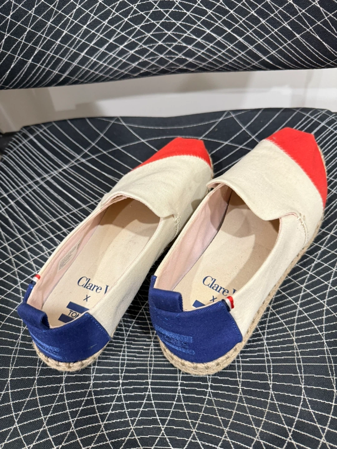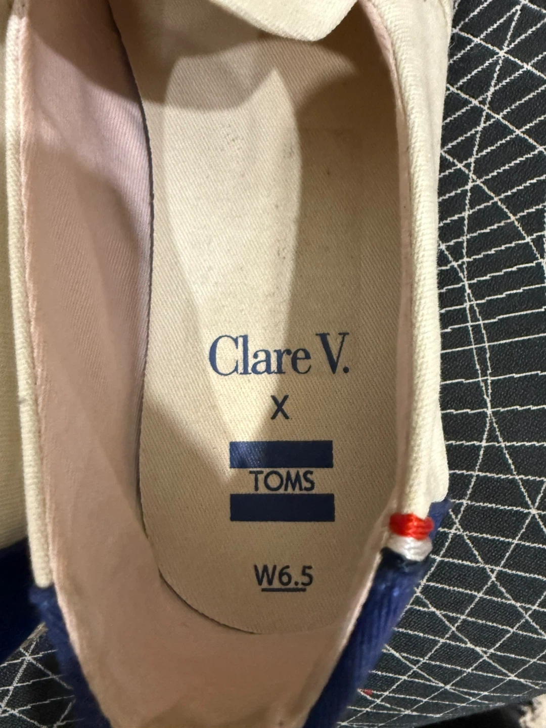 Selling a pair of TOMS x Clare V. women's espadrille slip-on shoes in size 6.5! They feature a unique design with a red, white, and blue colour scheme. These shoes are perfect for adding a touch of style to your casual outfits