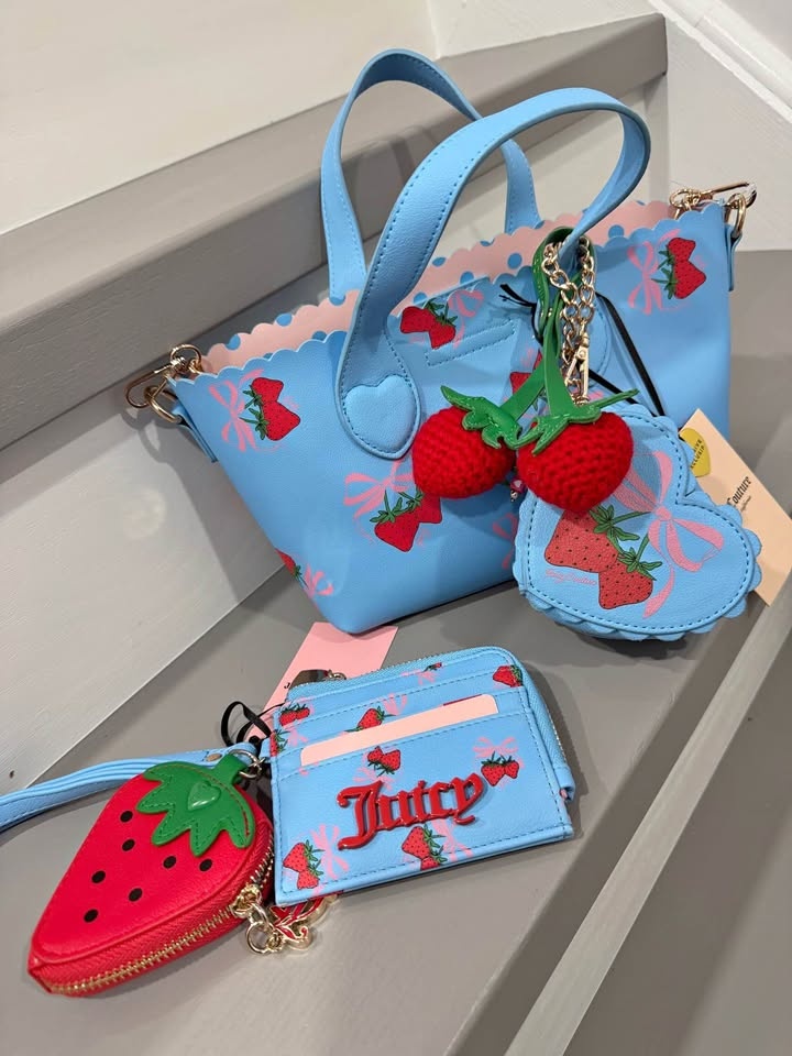 Adorable Juicy Couture set. Light blue handbag with strawberry and bow print, matching cardholder wallet, and a cute red strawberry coin purse. Comes with two knitted strawberry charms on the bag. Everything is new with tags.