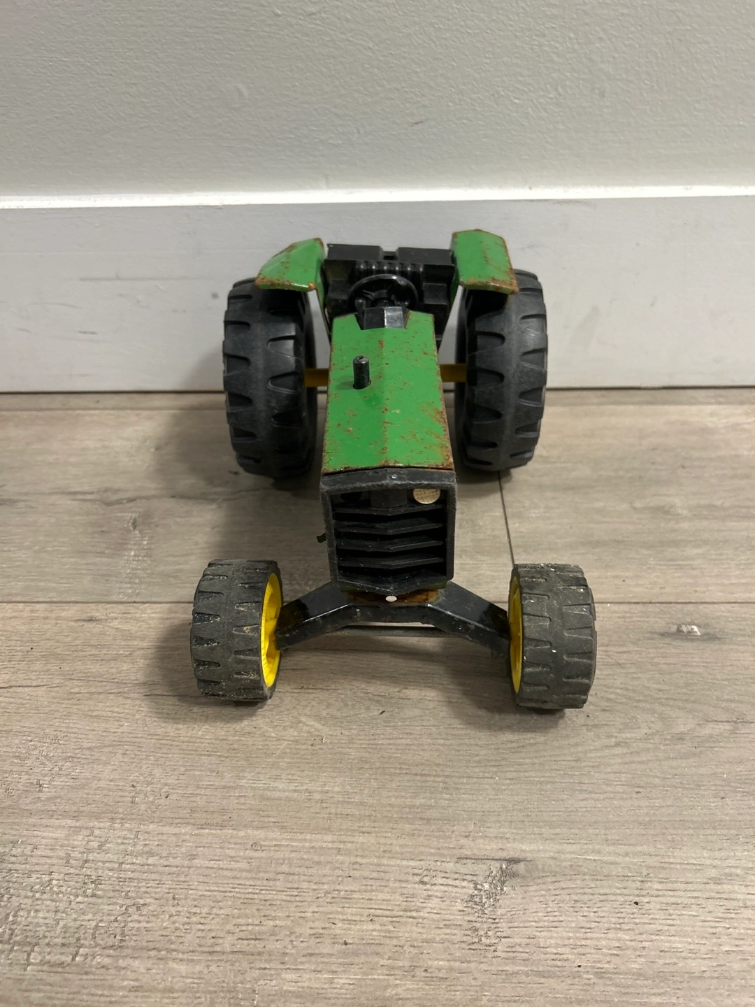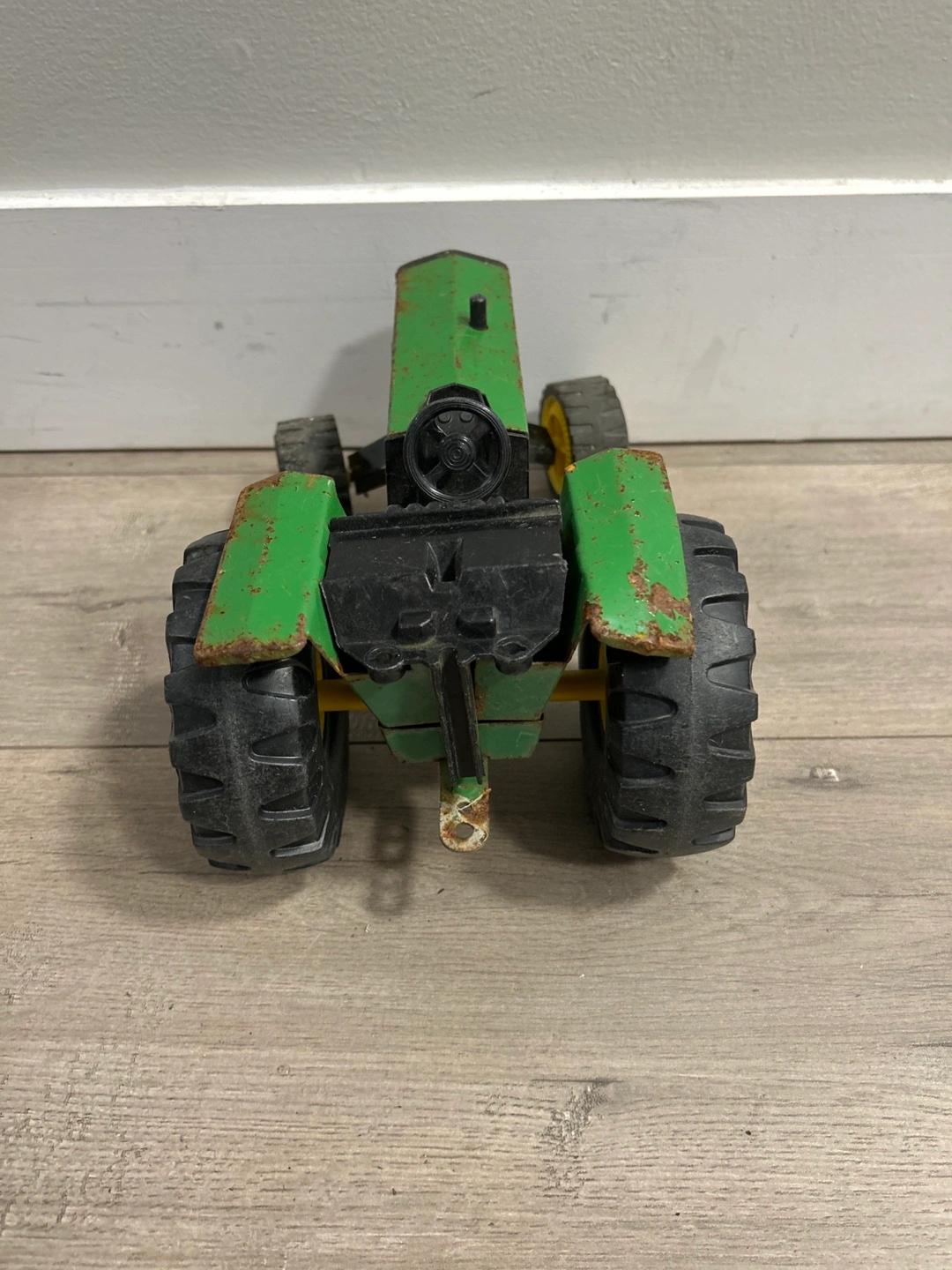 17Selling a John Deere Tonka tractor toy! It's green and black with yellow wheels. It has some signs of wear and tear, but it's still a great toy for any young farmer! One of headlights missing and steering wheel mechanism doesn’t work