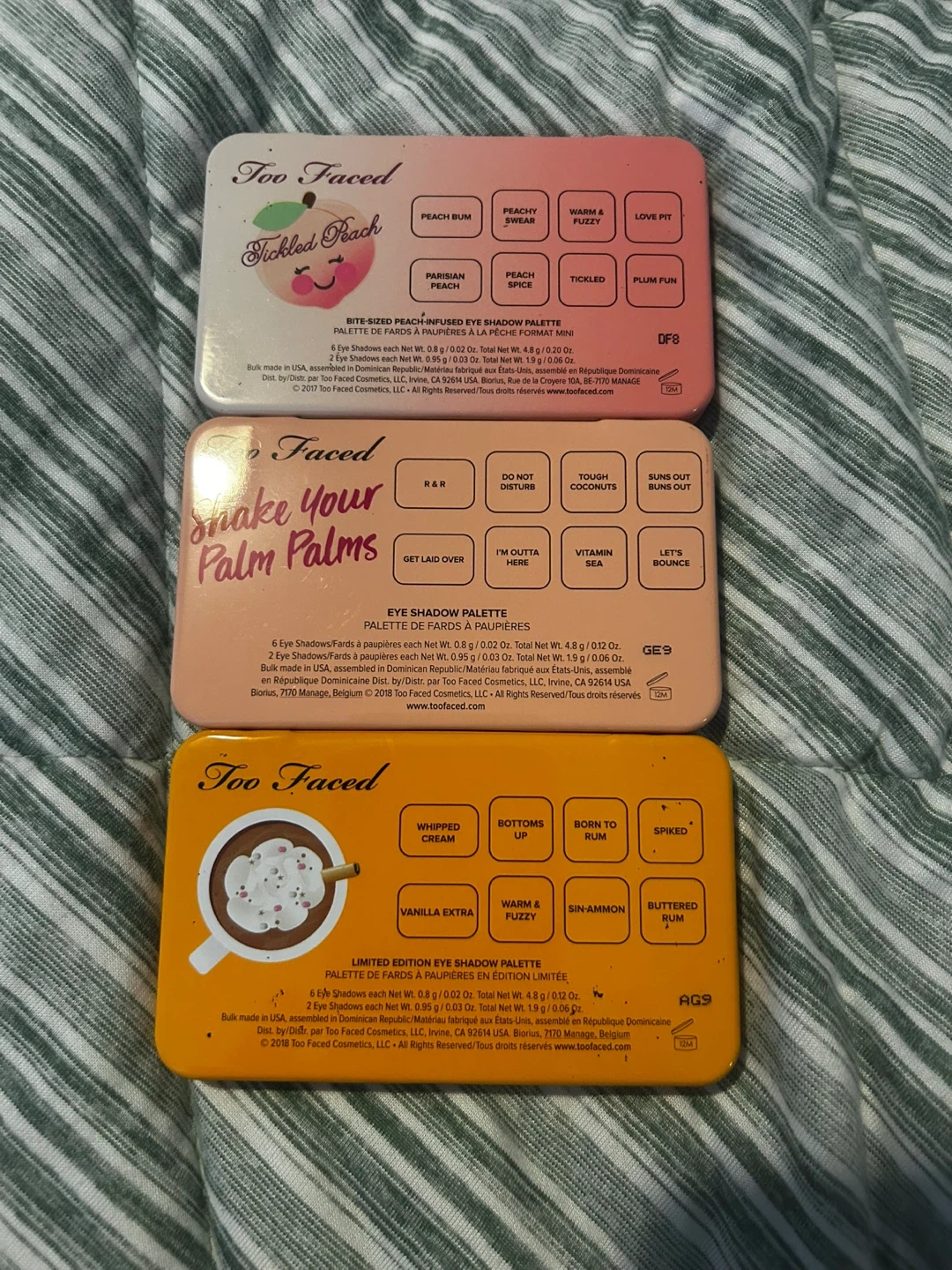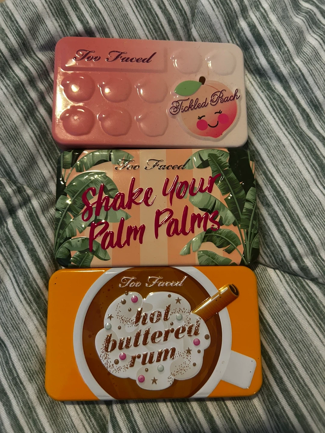 425Selling a bundle of three Too Faced eyeshadow palettes! Includes the Tickled Peach, Shake Your Palm Palms, and Hot Buttered Rum palettes. All in mint condition . Cash only Pick up Mississauga