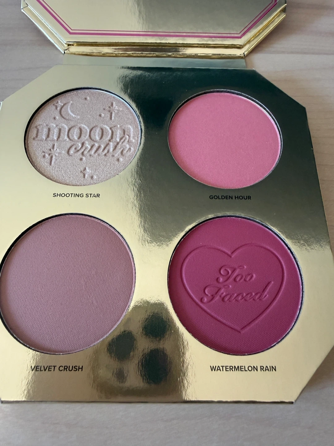 Selling a Too Faced Jewel Crush limited edition blush and highlighter palette! It features four beautiful shades: Moon Crush (highlighter), Shooting Star (blush), Golden Hour (blush), Velvet Crush (blush), and Watermelon Rain (blush)