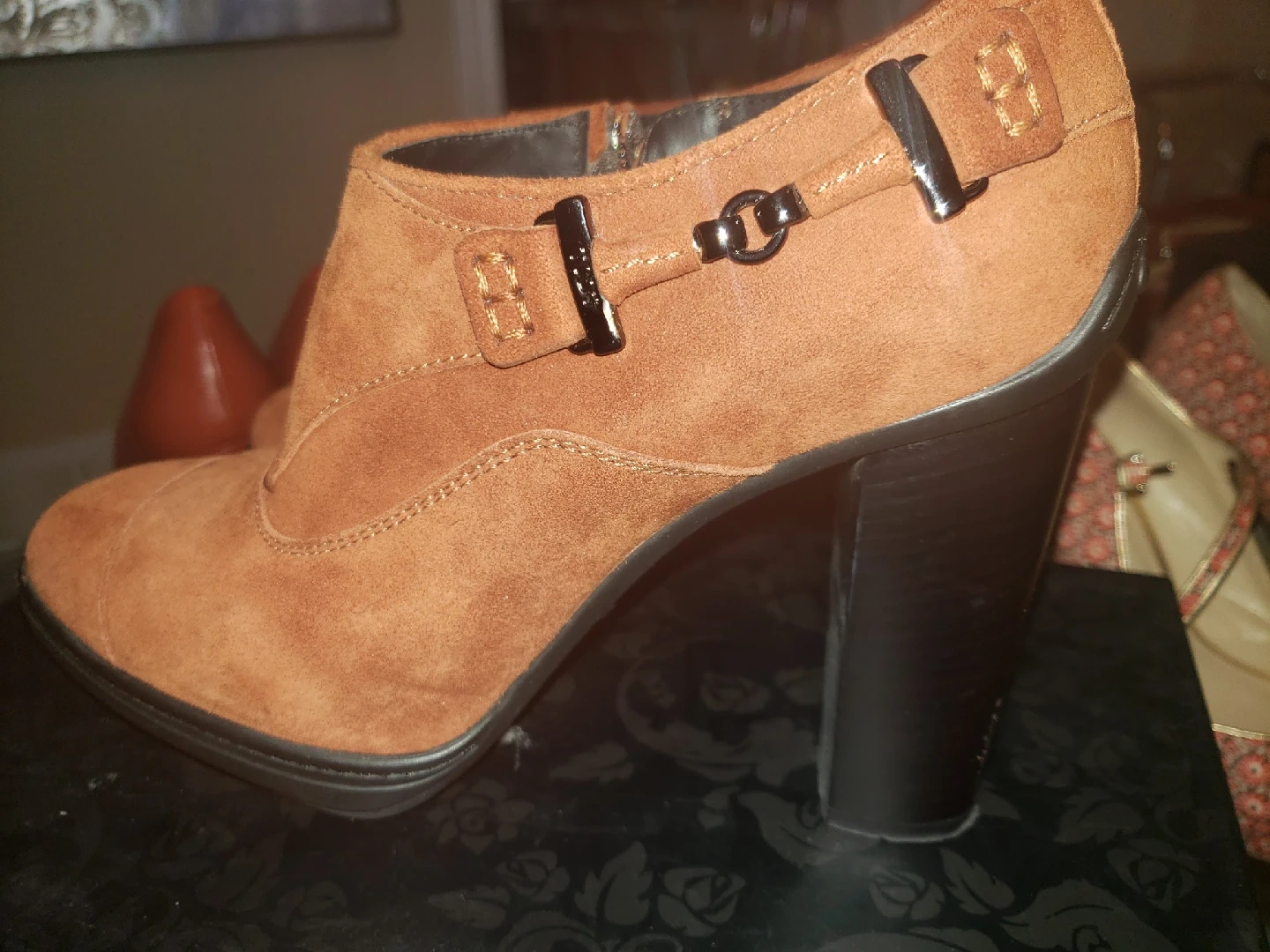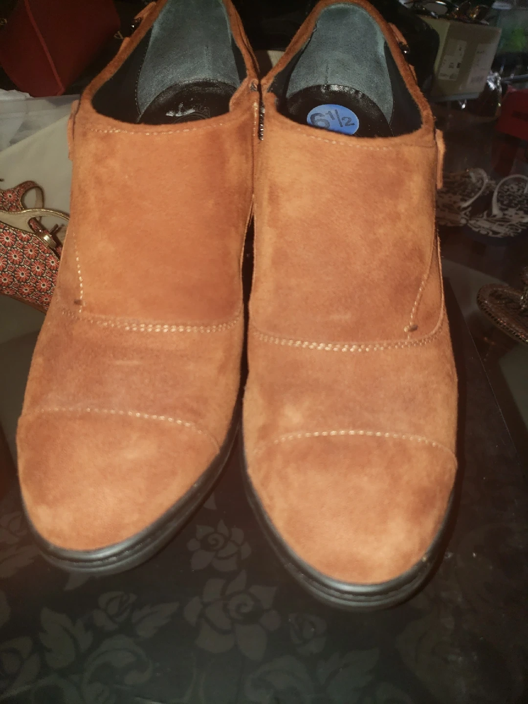 Check out these stylish Toods ankle boots! They're a beautiful brown suede and in great shape. The size is 6.5, so they should fit comfortably. They feature a nice heel and buckle detail, making them perfect for dressing up or down. If you're looking for a versatile pair of boots, these are a great choice!