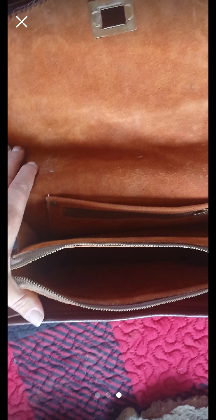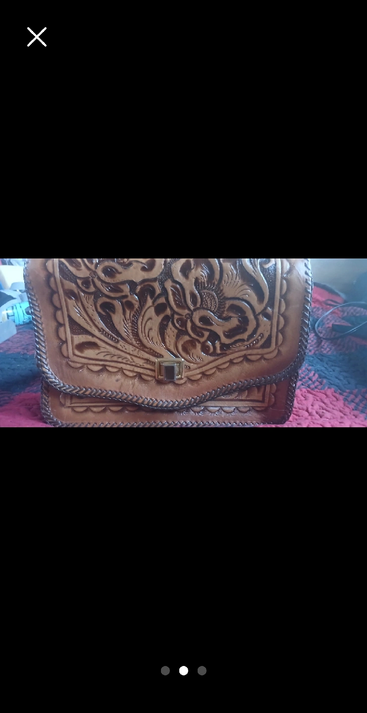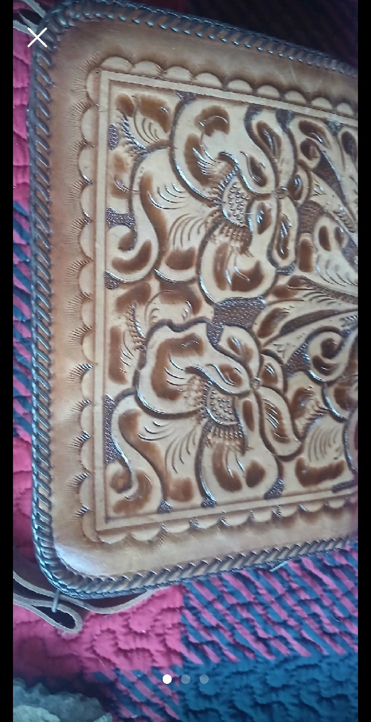 15Selling a beautiful tooled leather handbag. It features a unique floral design and a braided edge. The inside has a zippered compartment and additional pockets