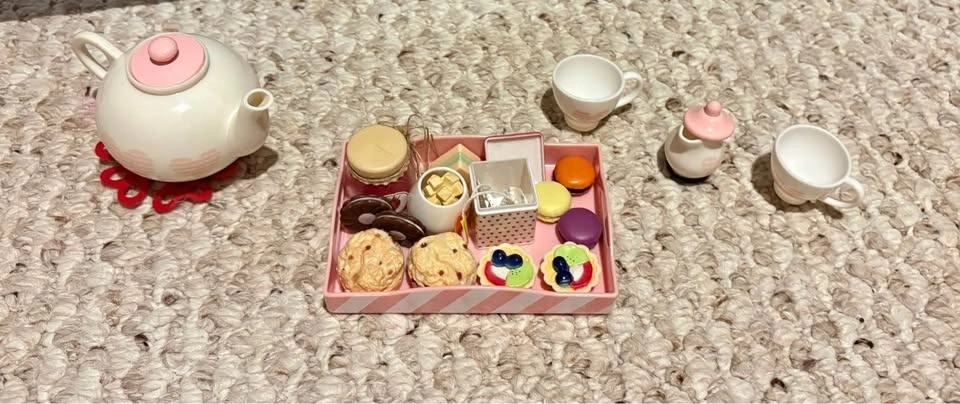 Sweet Our Generation doll tea party set including teapot, teacups, creamer, sugar bowl, and a dessert tray with assorted pastries and treats. All pieces are in excellent condition and have been gently used. From a smoke-free home. LaSalle pickup. Check out my other American Girl listings.