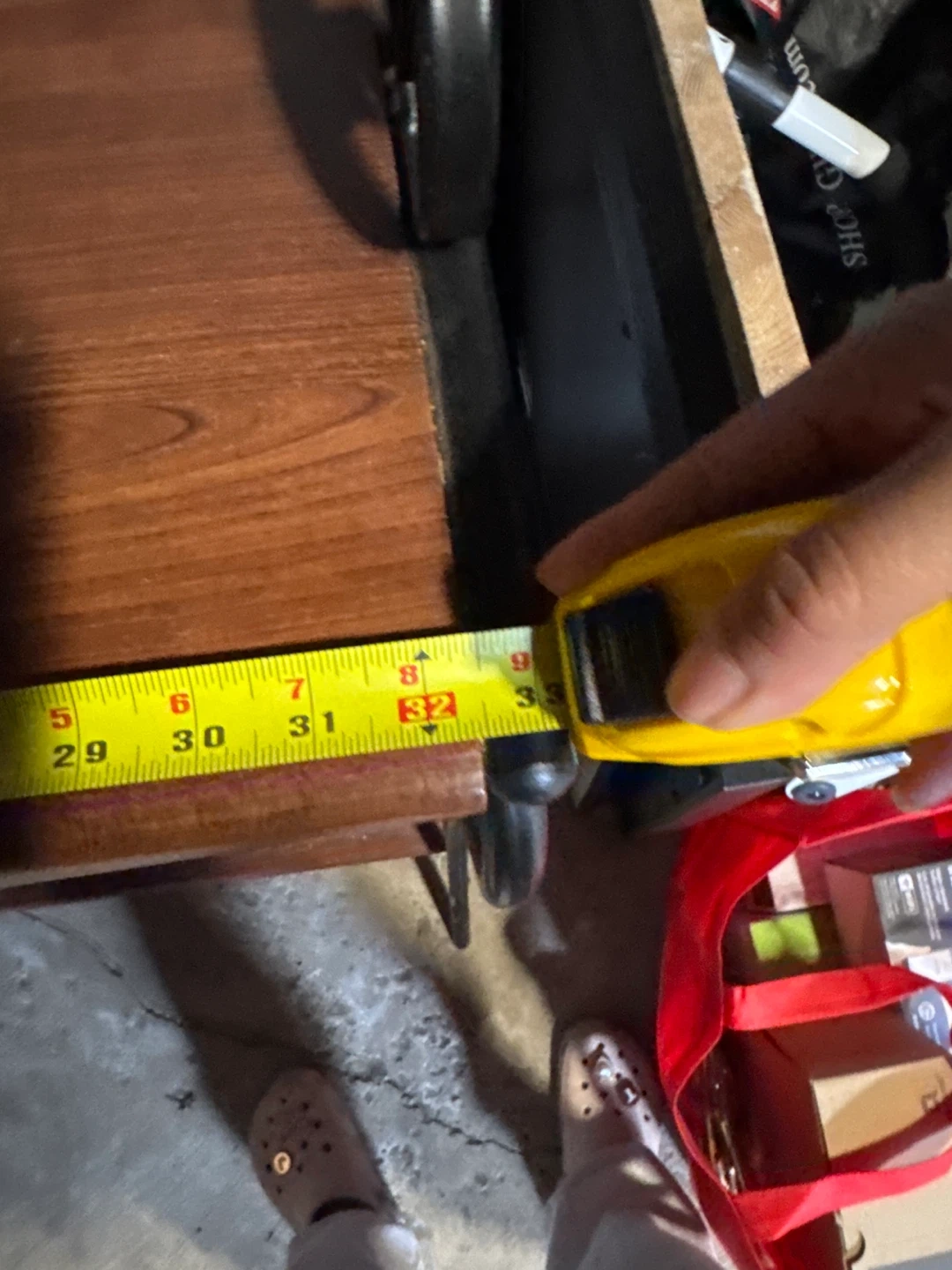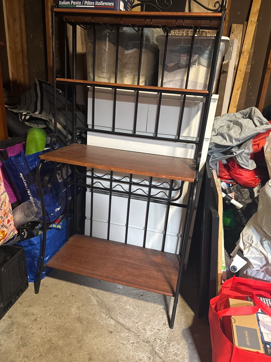 This baker's rack features three wooden shelves and a black metal frame. The overall dimensions are approximately 31 inches wide and 64 inches tall. It's a handy piece for kitchen or pantry storage!