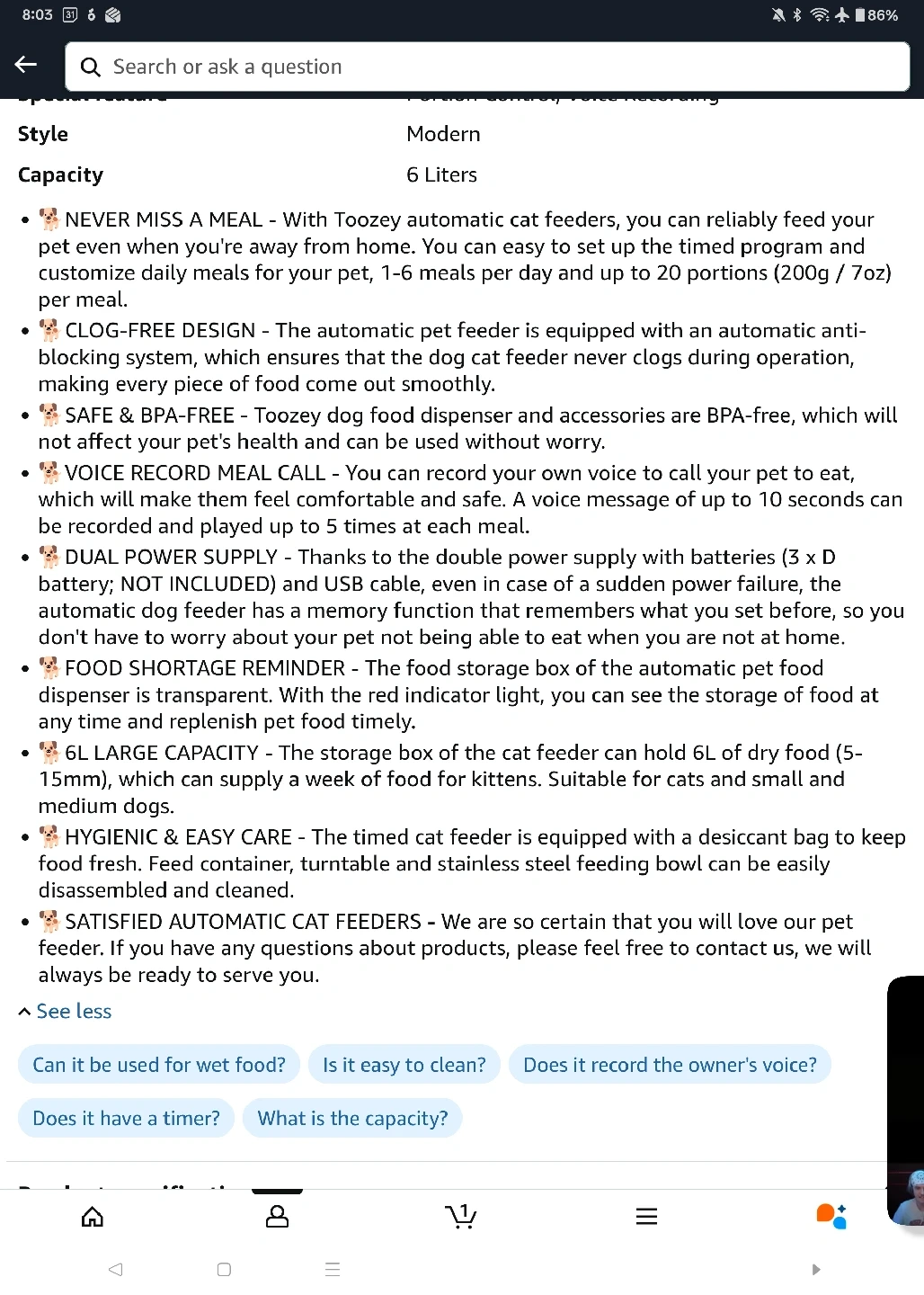 15I'm selling a Toozey automatic pet feeder with a 6L capacity! It's designed to reliably feed your pet even when you're away from home. You can set up timed programs for 1-6 meals per day, up to 20 portions per meal. I originally purchased this feeder for $79. My cat needs to be on a strictly wet food diet now and have no use for it. I've loved using this feeder, it is super simple and I've never had a problem with it. Key features: - Clog-free design with an anti-blocking system - BPA-free materials - Voice record meal call (record your voice to call your pet to eat) - Dual power supply (batteries not included) - Food storage reminder (transparent food storage) - Easy to clean