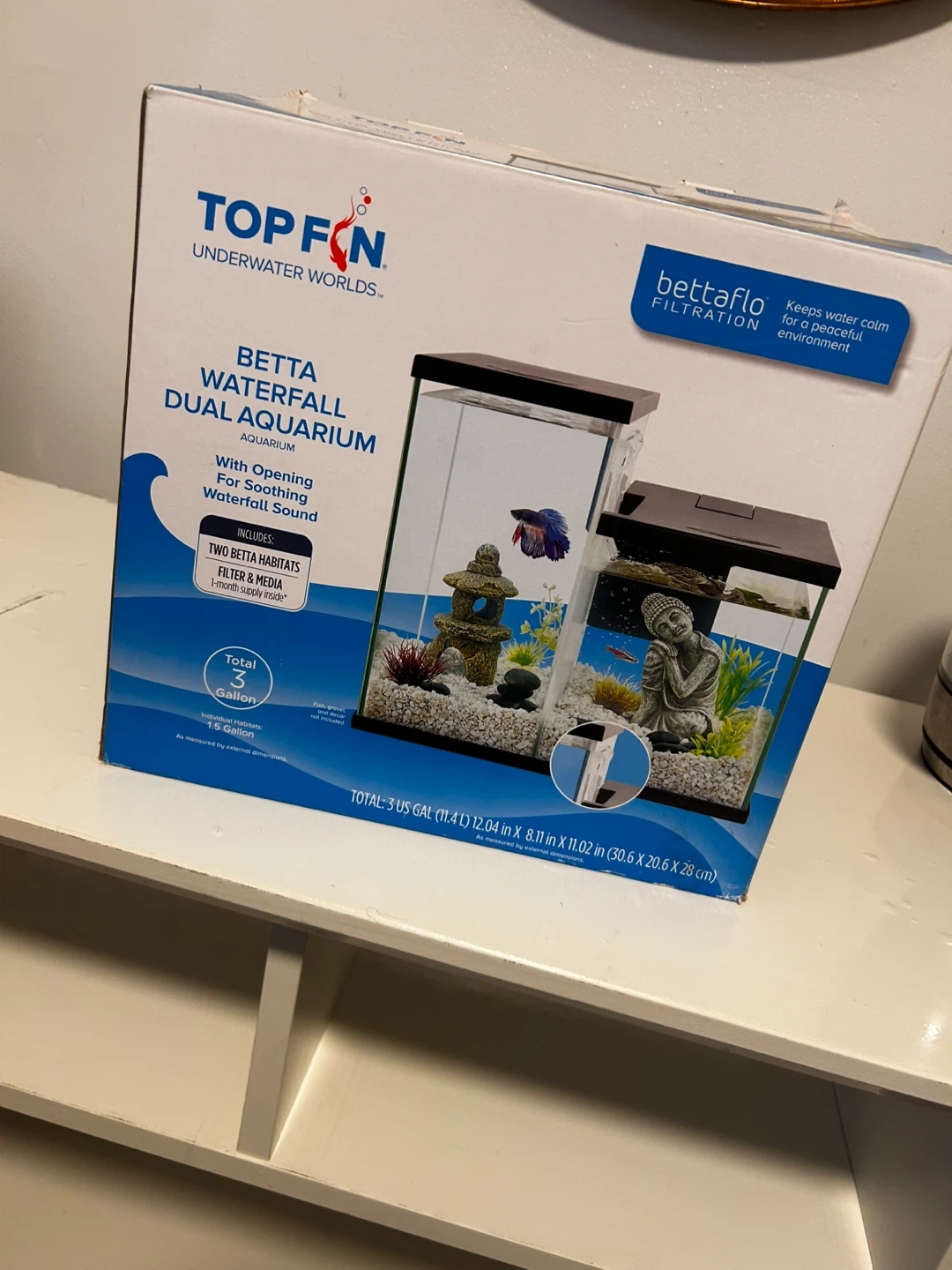 Selling a Top Fin Betta Waterfall Dual Aquarium. It's a 3-gallon aquarium with two betta habitats included! It also comes with a filter and media for a 1-month supply, and an opening for a soothing waterfall sound. The dimensions are 12.04 in x 8.11 in x 11.02 in (30.6 x 20.6 x 28 cm)