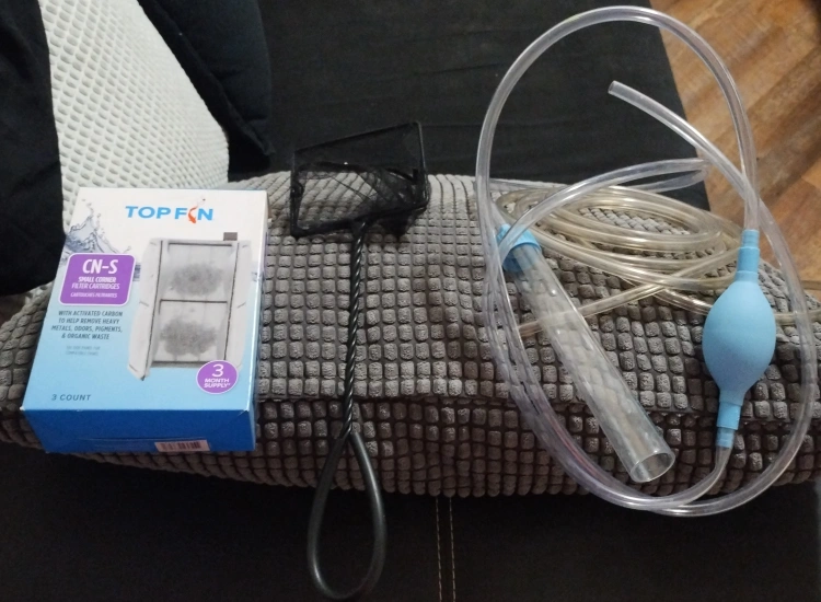 Selling a Top Fin CN-S small corner filter cartridges, 3 count, along with a fish net and a gravel vacuum. All you need to keep your fish tank clean!