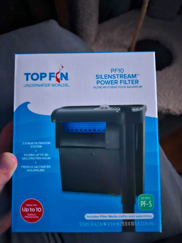 10This Top Fin Silenstream PF10 aquarium power filter is designed to filter up to 90 gallons per hour for fresh and saltwater aquariums up to 10 gallons, providing a 3-stage filtration system. This filter is new and has never been used. Features: * 3 Stage Filtration System * Filters Up To 90 Gallons Per Hour * For Fresh & Saltwater Aquariums * Ideal for up to 10 Gallon Aquariums. Looking at similar filters, I think $20 is a fair price. If the ad is up, then it is still available! (NEVER USED BRAND NEW) Payment: Cashless payment, Cash accepted