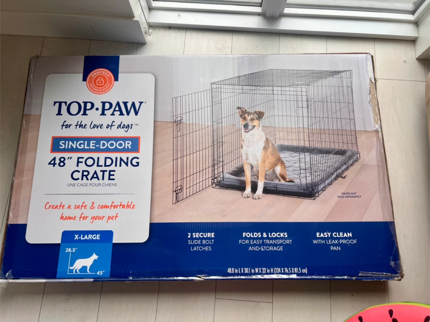 75Selling Top Paw Single-Door 48” Folding Crate (X-Large) - like new in box. ✨ Features: • Sturdy single-door design with 2 secure slide-bolt latches and a divider • Folds flat for easy transport and storage • Leak-proof bottom pan for quick cleaning • Dimensions: 48.8” L x 30.1” W x 32” H