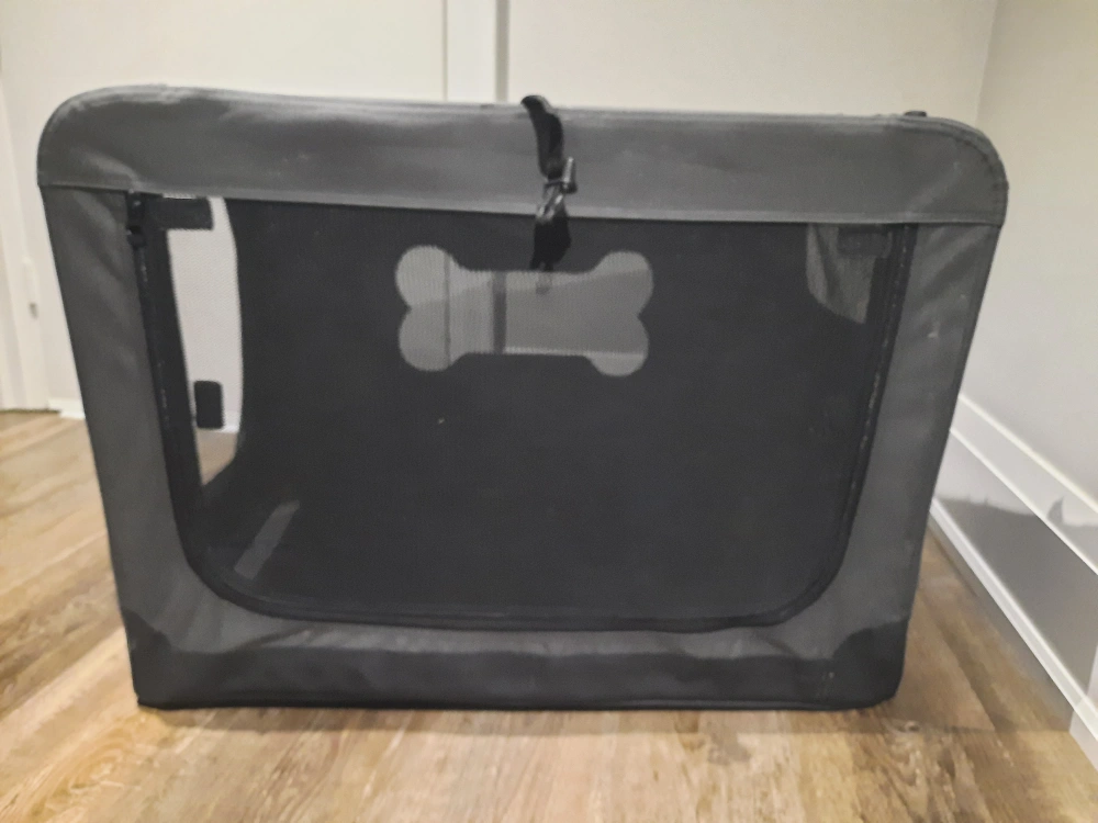 Selling a Top Paw dog crate in great condition! It's a nice grey colour and features a zippered door and bone-shaped mesh windows for ventilation. Perfect for travel or providing a safe space for your furry friend