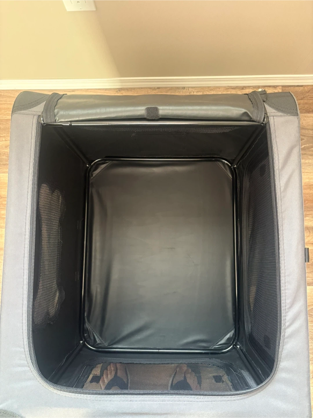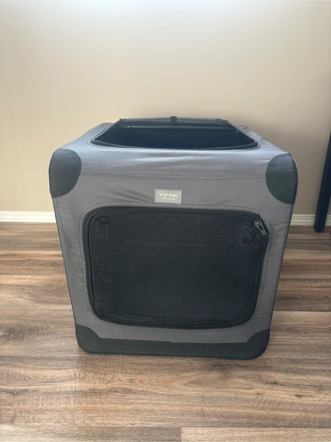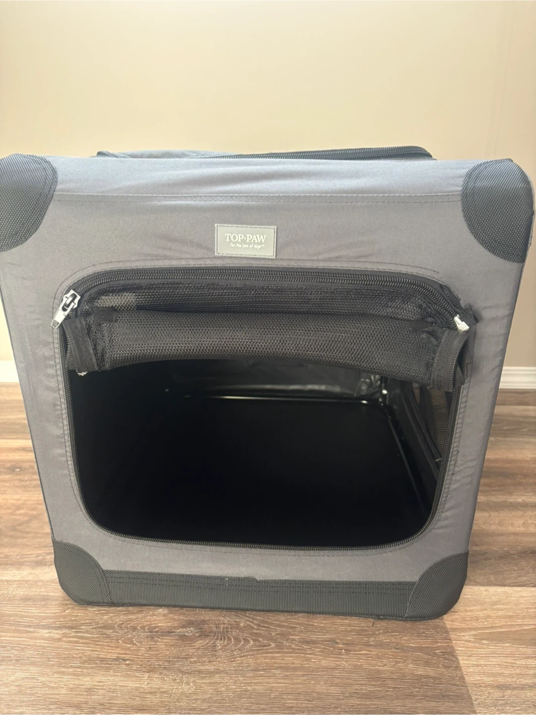 0TOP PAW soft crate for your pet. Portable and collapsible. Double doors, top and front. Secure zipper closures; fastening straps keep unzipped rolled-up doors positioned neatly out of the way. PVC frame and Polyester fabric; sets up and dismantle in seconds. No tools needed. Weight: 8lbs Dimensions: 26”L x 21”W x 21.25”H