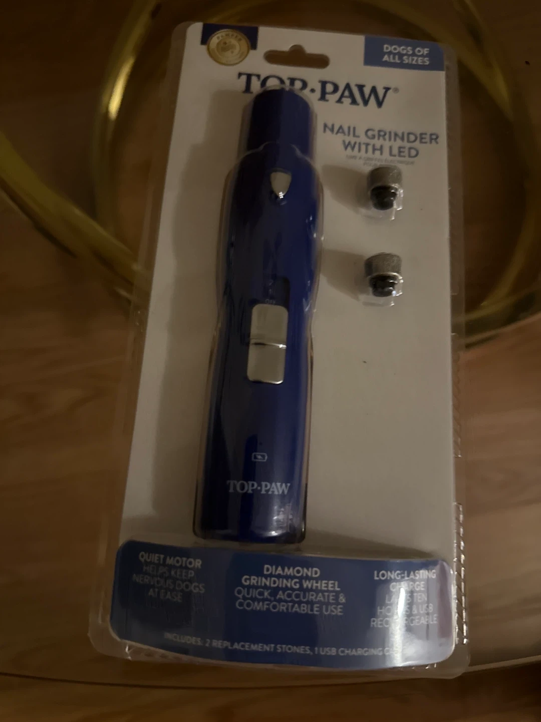 I'm selling a brand new Top Paw nail grinder with LED light, perfect for keeping your furry friend's nails trimmed and tidy. It's designed for dogs of all sizes. The grinder features a quiet motor to keep nervous dogs at ease, and a diamond grinding wheel for quick, accurate, and comfortable use. It also has a long-lasting charge and is USB rechargeable. Included are 2 replacement stones and a USB charging cable