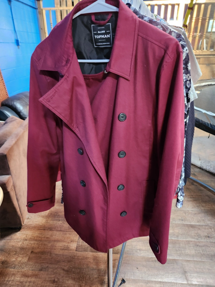 Here's a stylish burgundy double-breasted jacket from Topman! It's in great condition and ready for a new home. Perfect for adding a touch of sophistication to your wardrobe