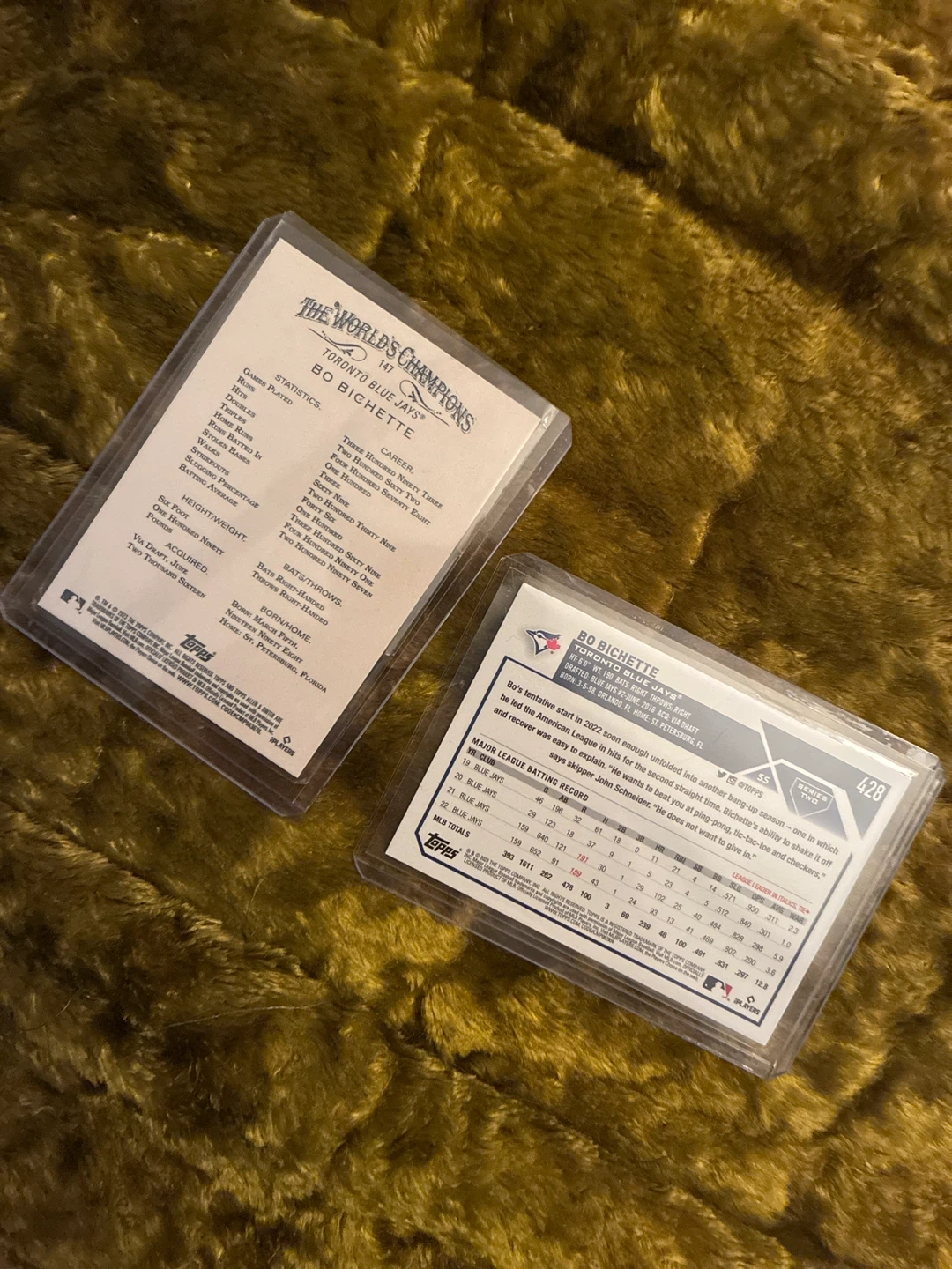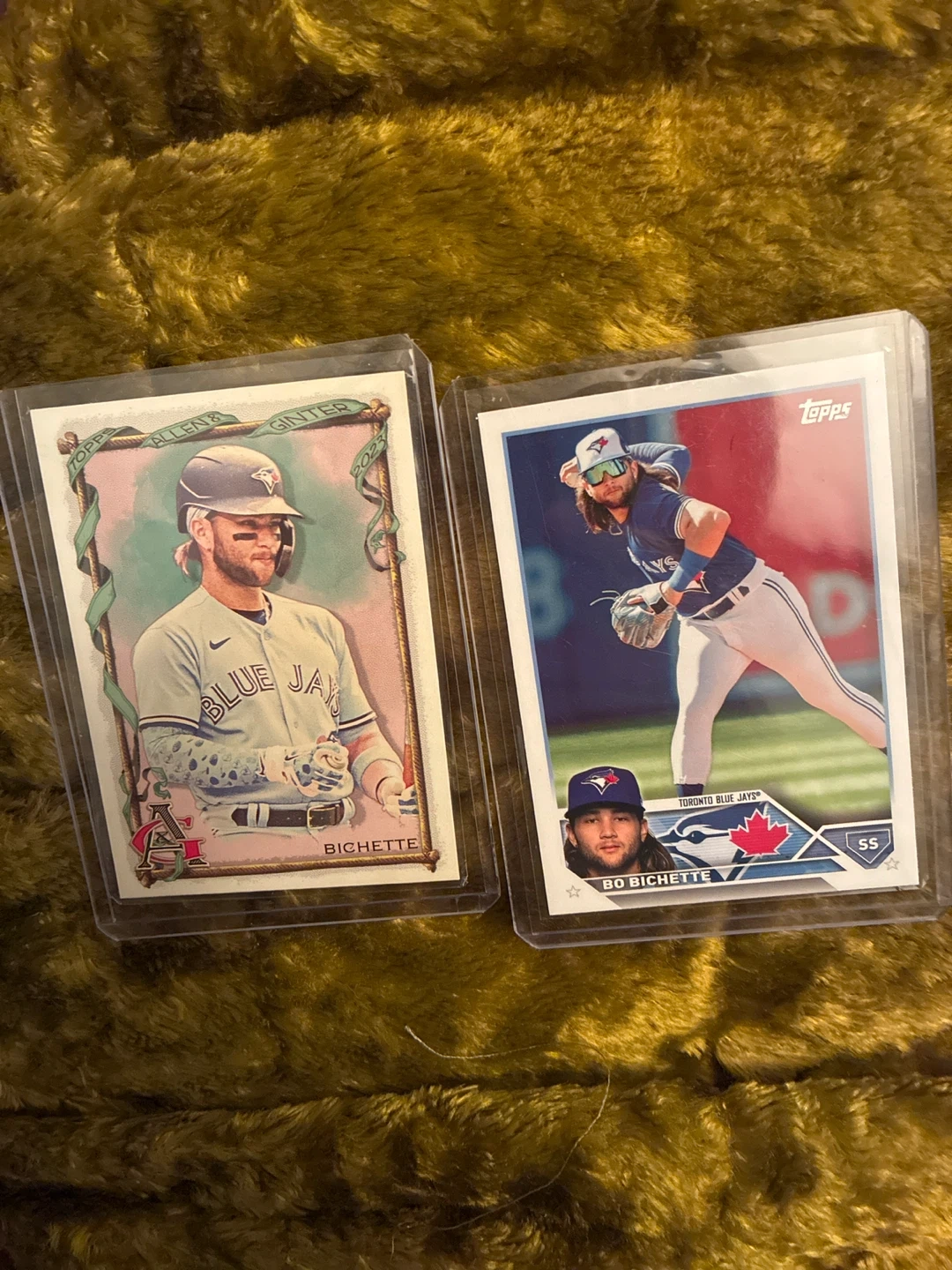 160Two Bo Bichette baseball cards featuring the Toronto Blue Jays. Both cards are in protective cases.