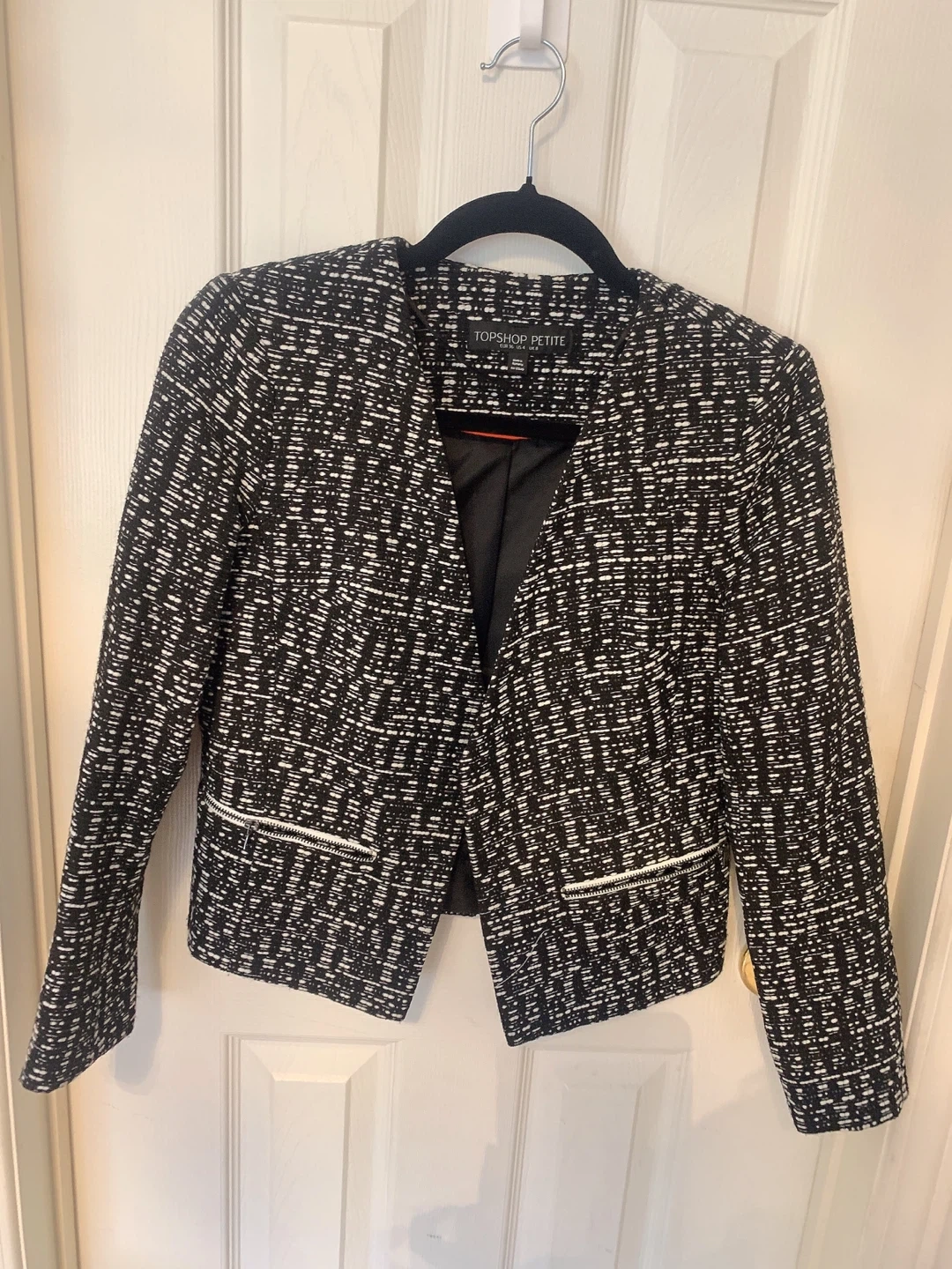 31Selling a Topshop Petite blazer in a black and white woven pattern. It's a size US 4 New without tag Length 54cm Chest 42cm