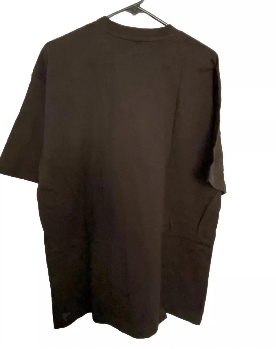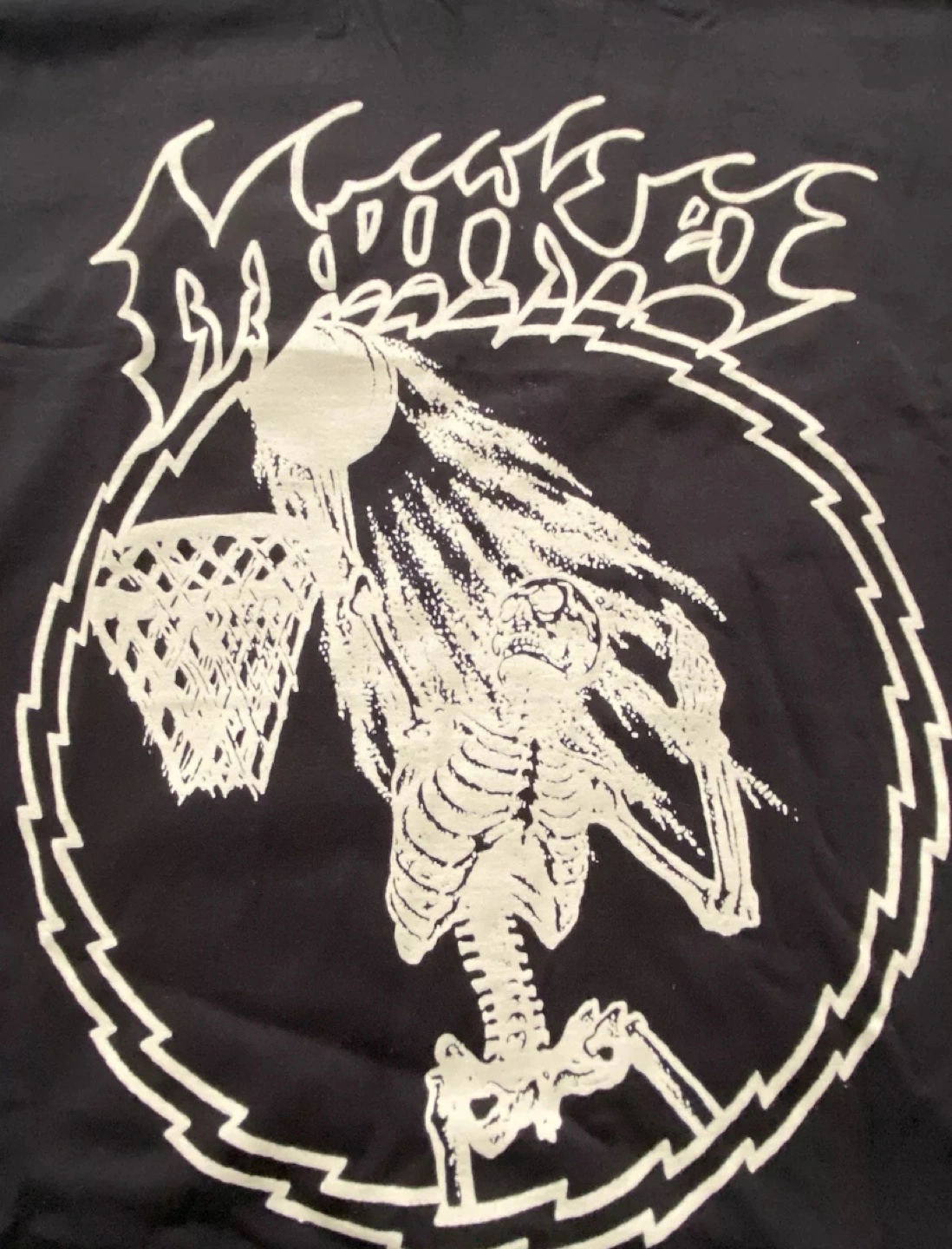 Black t-shirt with a white graphic of a skeleton playing basketball. Size L.