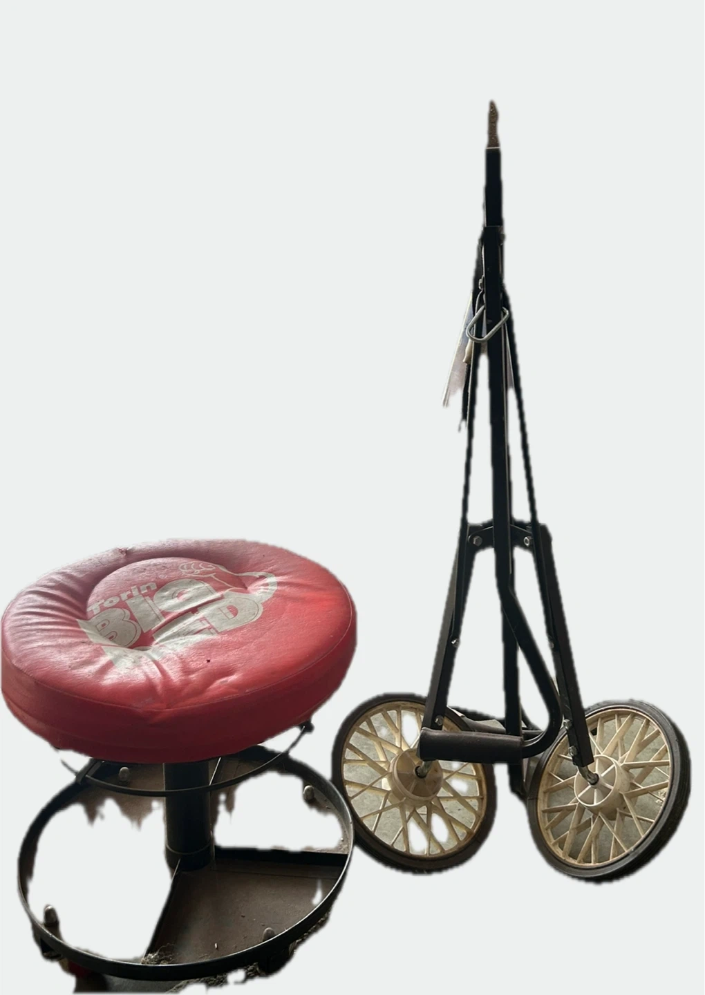 Selling a Torin BIG RED rolling creeper seat and a mower lift. The seat has a red cushion and the mower lift is black with white wheels. Both items show signs of use.