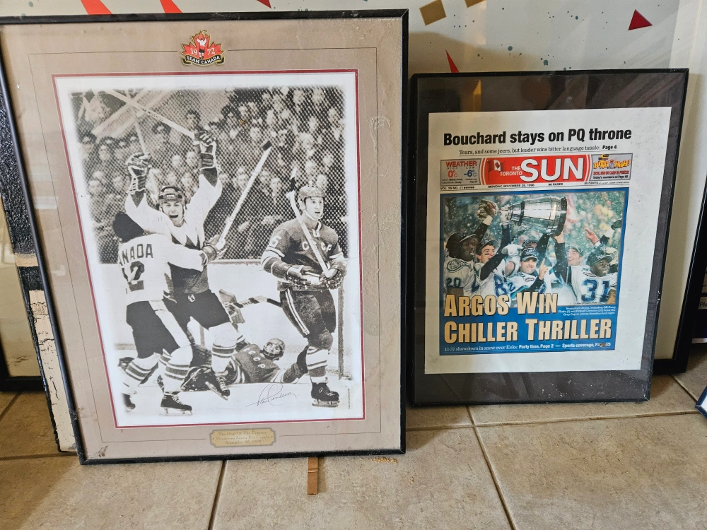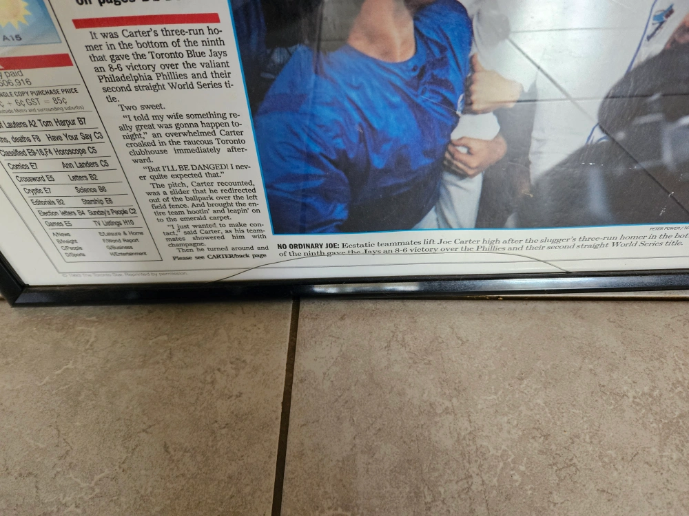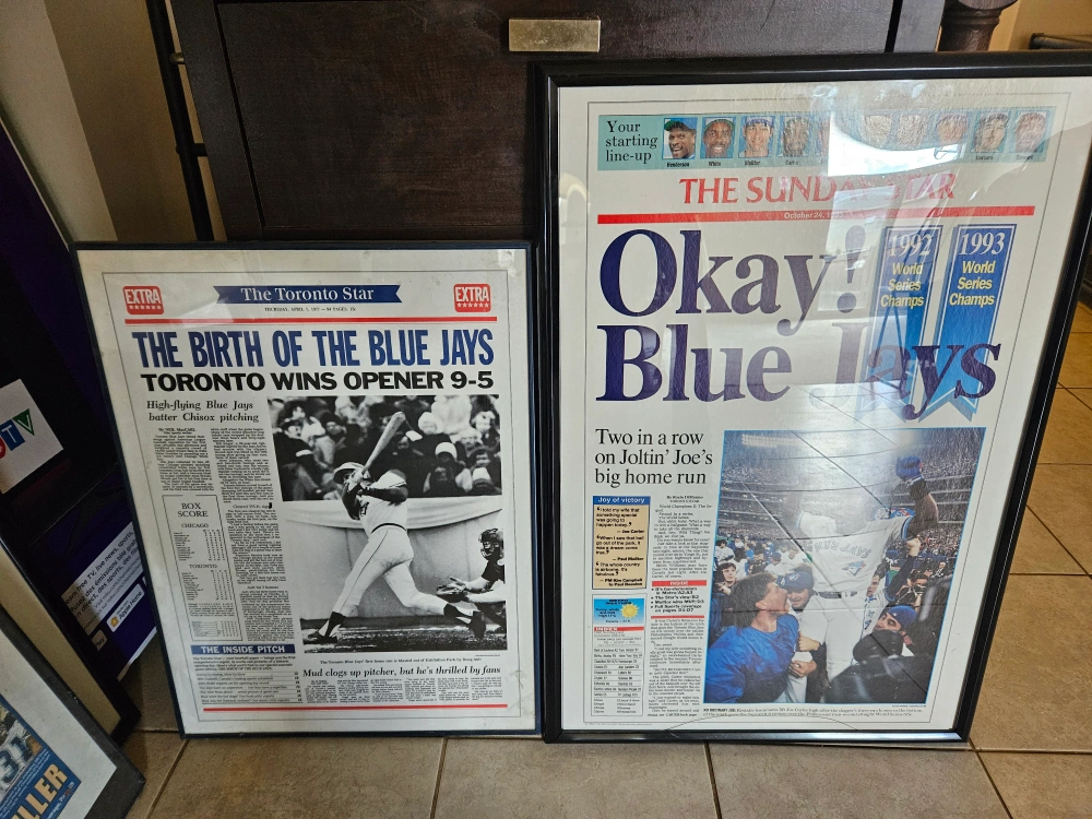 Selling a collection of framed newspaper prints related to the Toronto Blue Jays and other sports events. These prints capture iconic moments and are perfect for any sports enthusiast or collector. They'd look great in a home office, den, or games room! The large Jay's picture has a crack in the glass. make an offer on one or all!